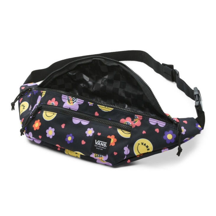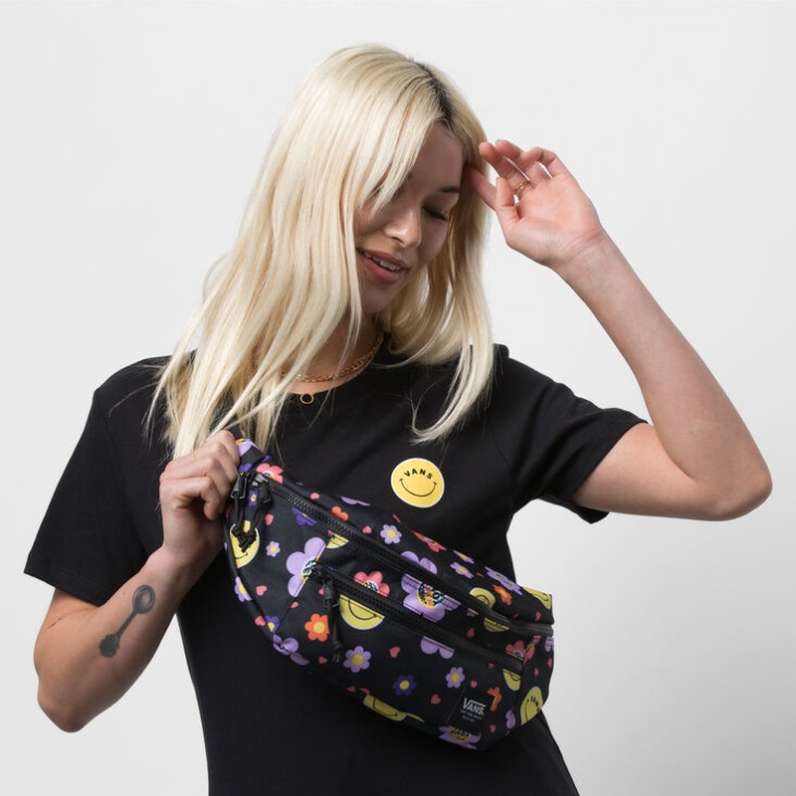 A bold allover floral and smiley face print stamps the Ranger Waist Pack, a versatile waist pack and crossbody bag with an adjustable strap, multiple pockets, and a workwear-inspired logo patch. - MATERIAL - 100% recycled polyester shell, 100% polyester lining - DIMENSIONS - 6.5 H x 17 W x 4 D inches