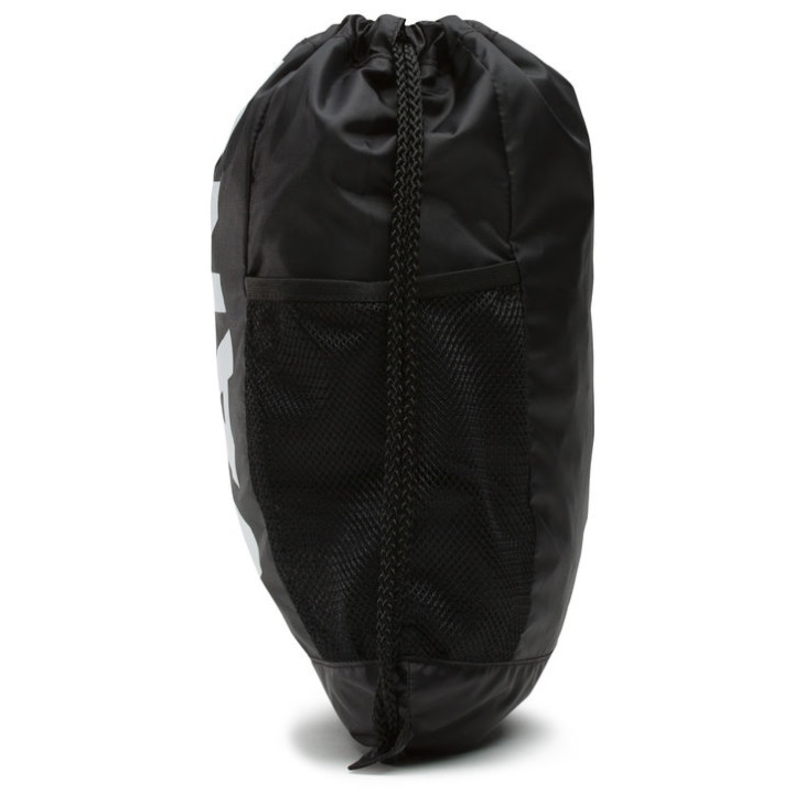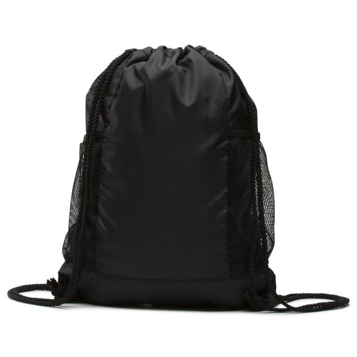 The Sporty Benched Bag is a 100% polyester lightweight cinched backpack with mesh side pockets. Measuring 17.5 L x 13.5 W inches, it features poly rope straps, a Vans screen printed logo, and a 12-liter capacity.