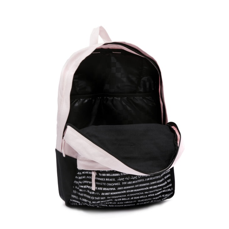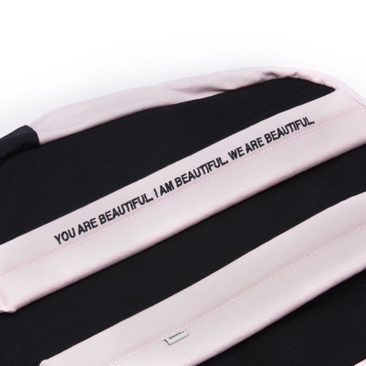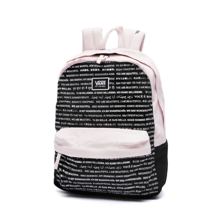 WE ARE BEAUTIFUL. You are beautiful. I am beautiful. We are beautiful-inside and out. As part of this collection, the Vans x We Are Beautiful Backpack encourages you to remind yourself and others of these positive affirmations in one of 15 different languages. It also features one large main compartment with a laptop sleeve, a front pocket with an organizer, and padded shoulder straps. - Vans x We Are Beautiful collection - 60% polyester, 40% recycled polyester - One large main compartment with a laptop sleeve - Front pocket with organizer - Padded shoulder straps - Dimensions: 16.75 H x 12.75 W x 4.875 D inches - Capacity: 22 Liters