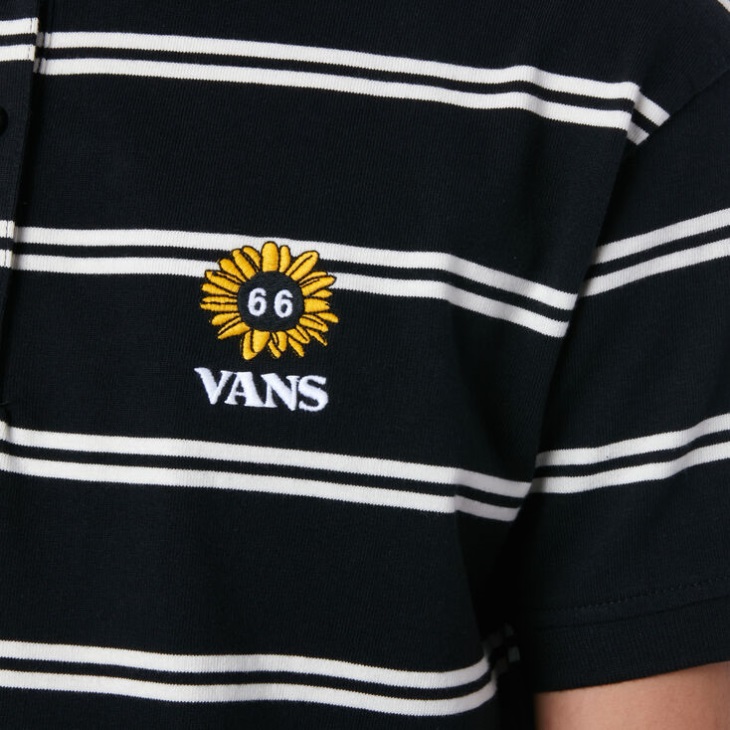 The 66 Sunflower Polo T-shirt is a 100% cotton polo tee in a horizontal striped pattern and small Vans logo on the front.