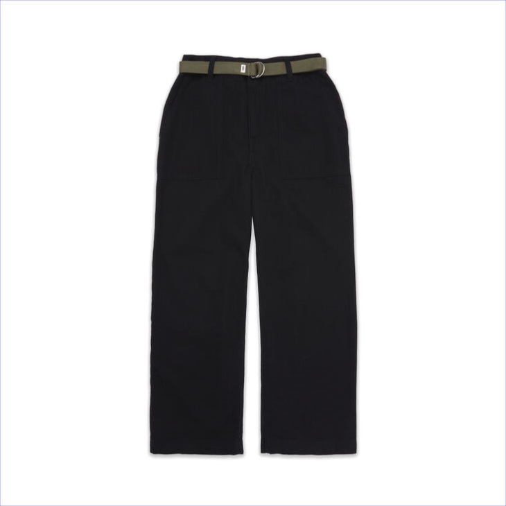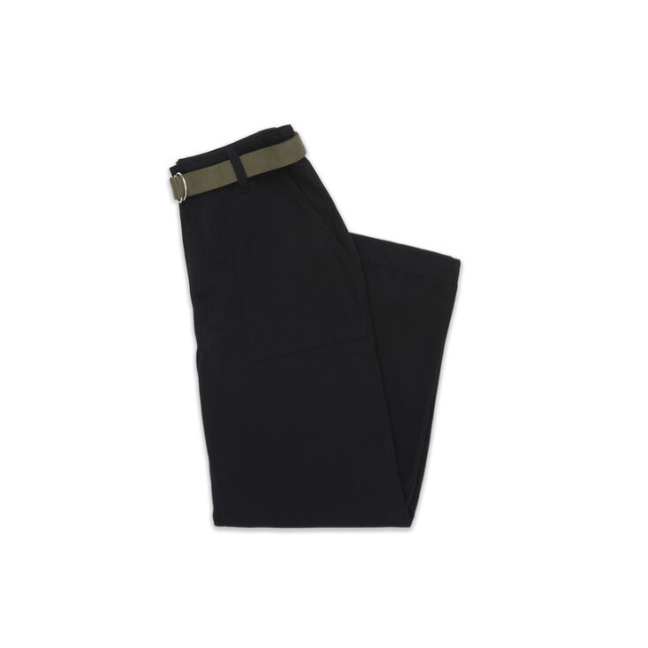The Clark Pant is a 100% cotton canvas high-rise pant with wide legs, patch pockets at the front and back, and a novelty web belt. Model is 5 feet 9 inches tall, has a 23-inch waist, and is wearing a size 26. - Rise: 12.5 inches - Inseam: 26 inches - Leg opening: 19 inches