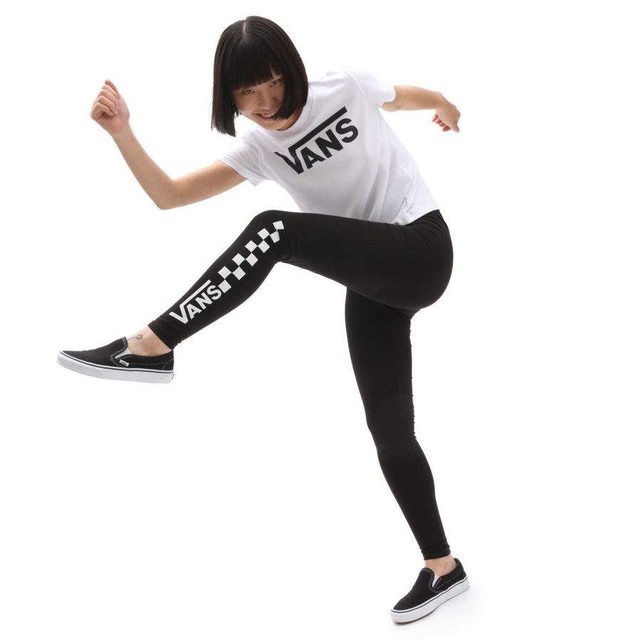 The Chalkboard Classic Legging is made with 93% cotton and 7% elastane with a 69.85 cm inseam and features a checkerboard logo screen print at the leg. Model is 178 cm tall, has a 58.42 cm waist, and is wearing a size Small.