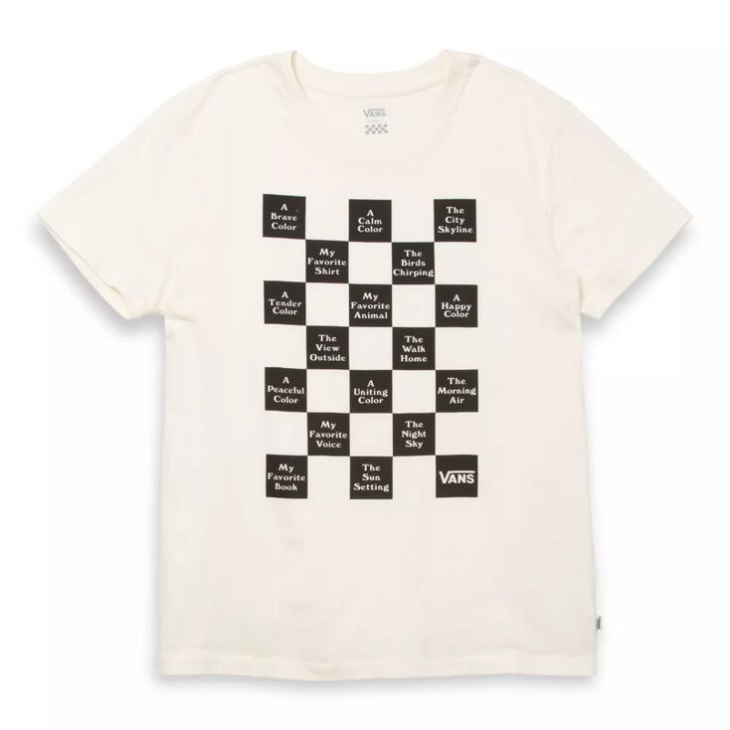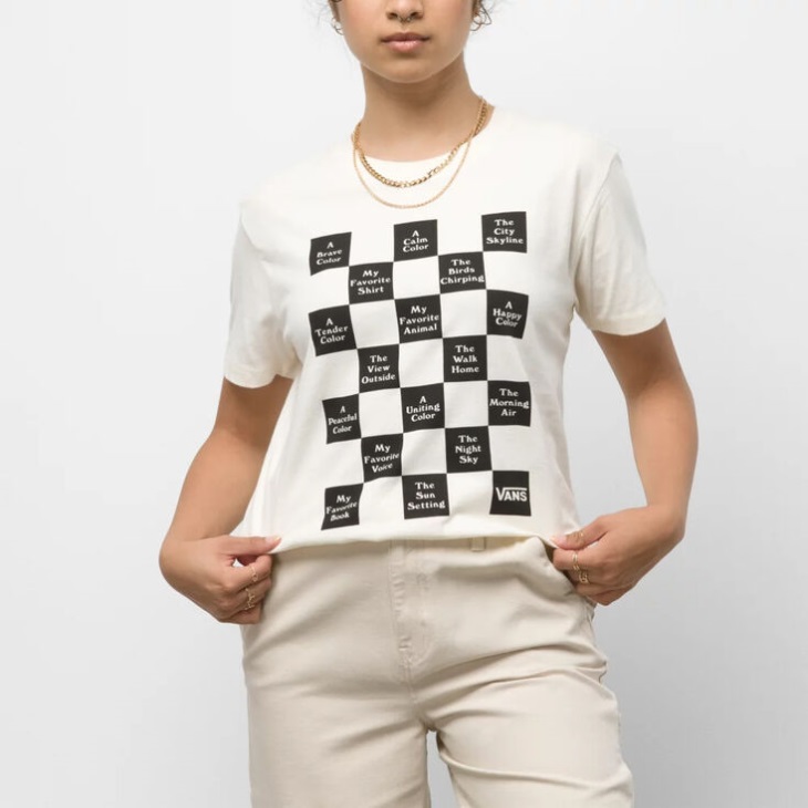 The Checkerboard Day T-shirt is a 100% cotton round-neck tee with a checkerboard print across the front.