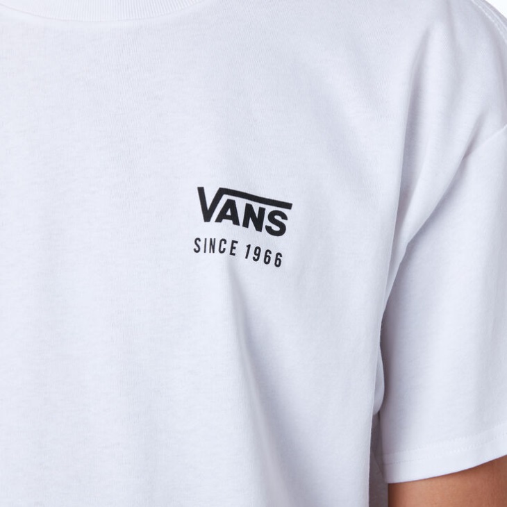 The Goovy Beat T-shirt is a 100% cotton round-neck tee in a collage flower design on the back and a small Vans logo.