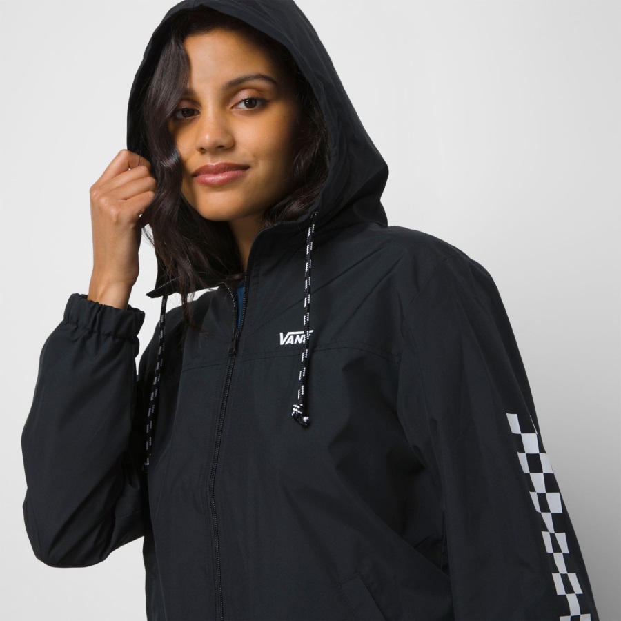 The Kastle Check Me Jacket is a water-resistant 100% polyester hooded windbreaker jacket with a full zip, checkerboard mesh lining, and a two-tone novelty drawcord. It also includes slit pockets at the hips and a classic logo screen print at the chest. Lyzy (She/Her) is 5' 10" tall and wears a size 26/S. Lyzy is wearing a Vans size S/26.