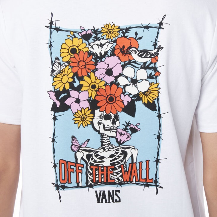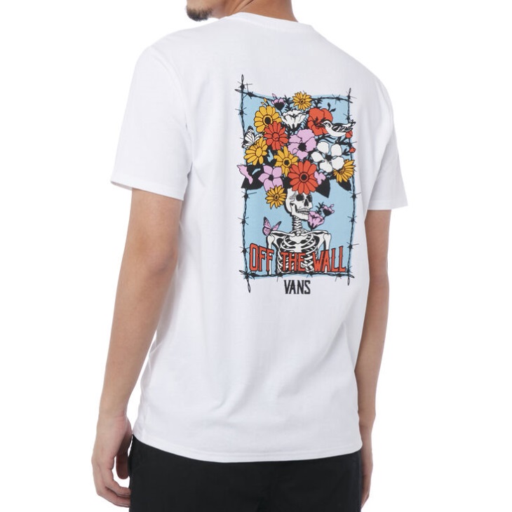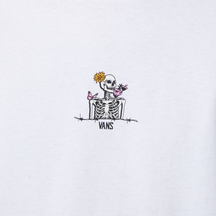 The Pretty Mindful T-shirt is a 100% cotton round-neck tee with a skele-flower Off The Wall design down the back and a simple skele illustration Vans logo on the front.
