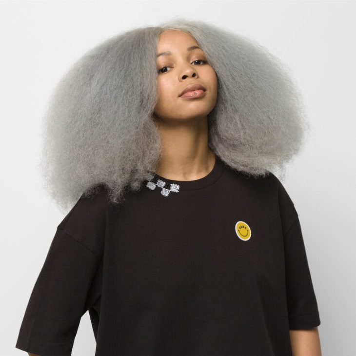 The Smilez Top is a 100% heavy cotton jersey tee featuring a vintage wash, elbow length sleeves, and a smiley face logo patch at the left chest. This relaxed fit t-shirt also includes checkerboard embroidery at the front neck seam for an added heritage vibe. Model is 5 feet 9 inches tall and wearing a size Small.