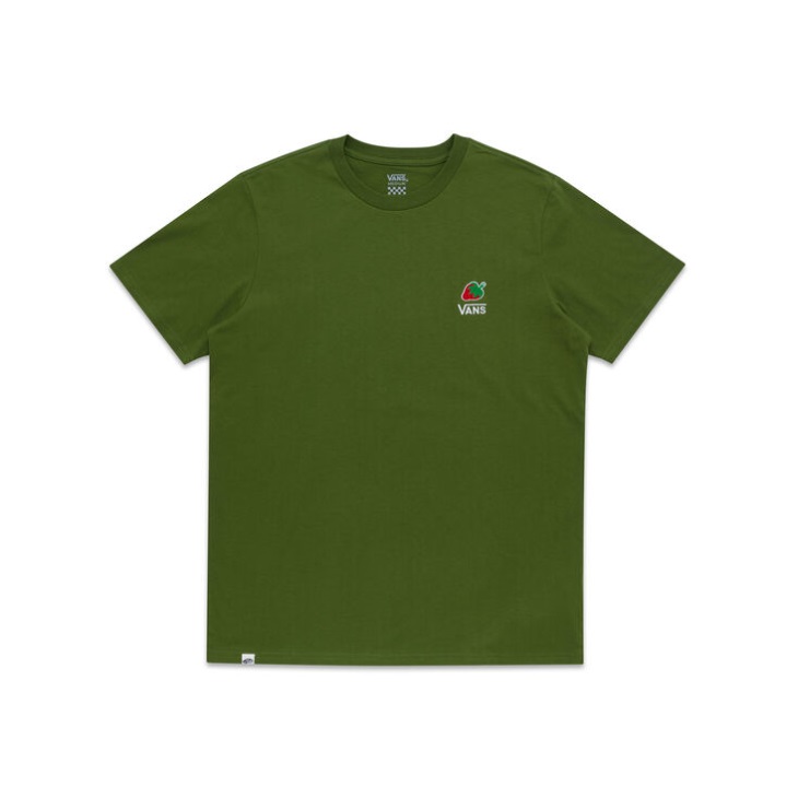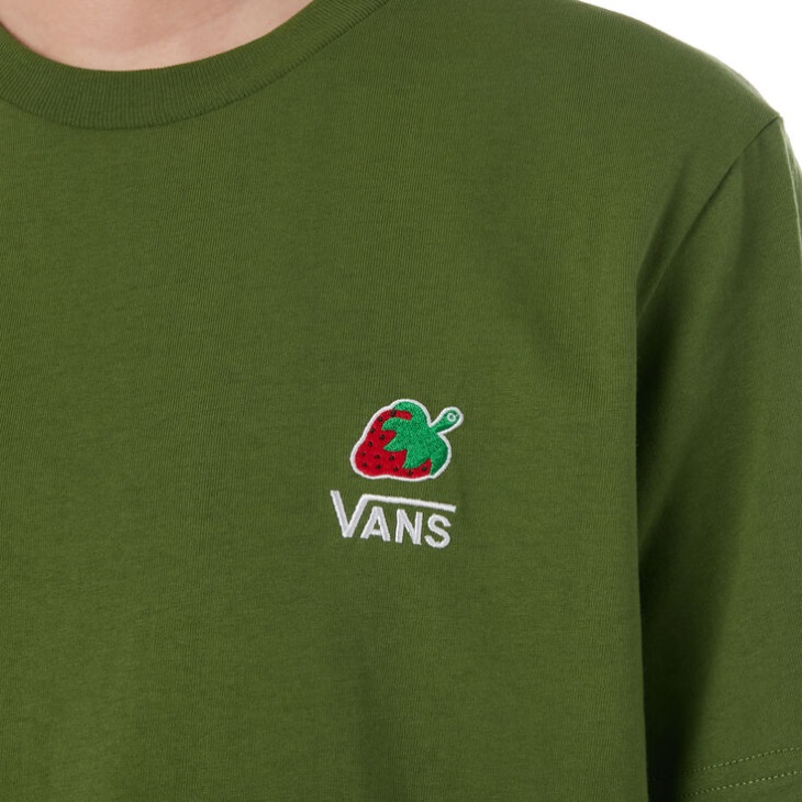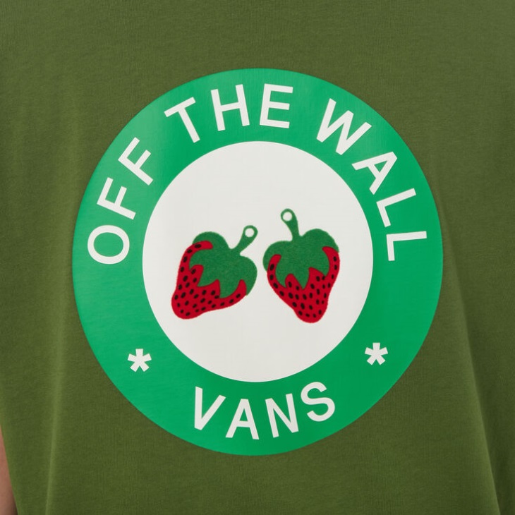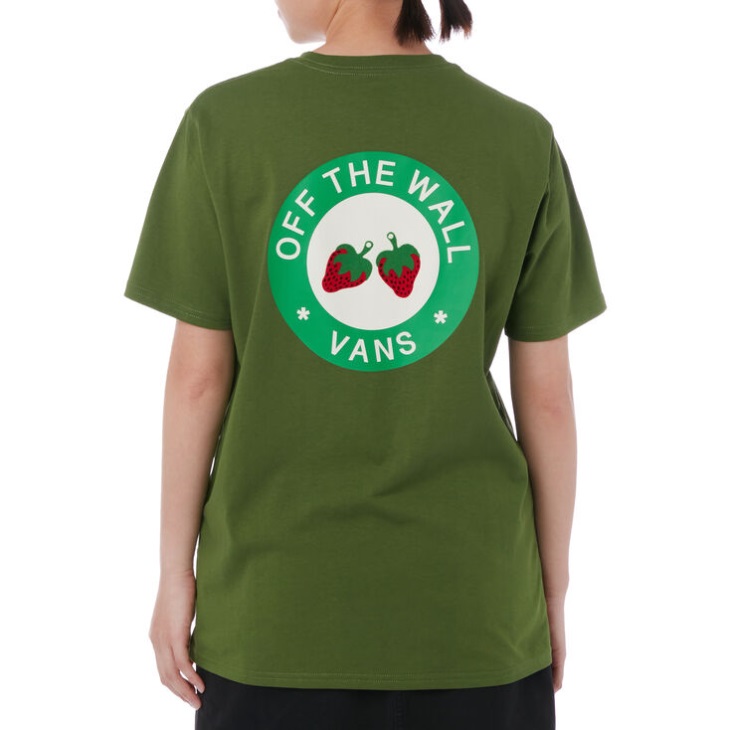 The Strawberry Garden T-shirt is a 100% carded cotton round-neck tee with a round Off The Wall Vans strawberry design on the back and a small logo on the front.