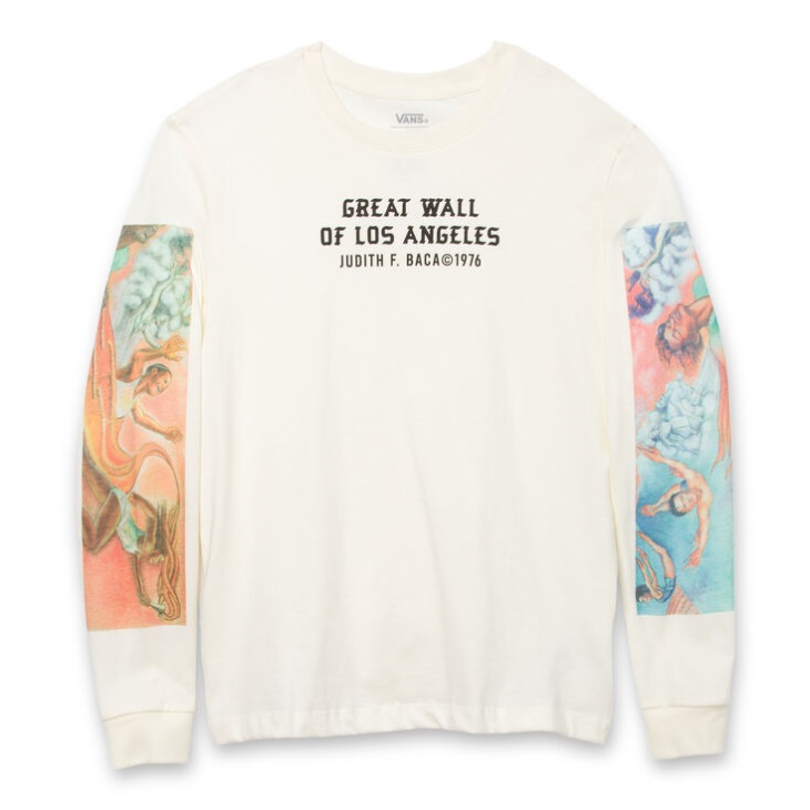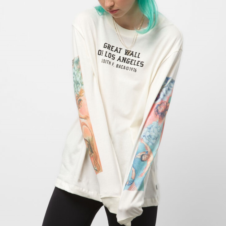 From our collection to yours Vans and the Museum of Contemporary Art, Los Angeles are two institutions that encourage the expression of creativity, and are committed to making creative expression accessible to everyone. This season, Vans and MOCA are proud to collaborate on a collection of footwear and apparel that celebrates creativity with California roots. Designed by Judy Baca and executed with the help of over 400 community youth and artists, the Great Wall of Los Angeles depicts the history of California as seen through the eyes of women and minorities. It is credited as one of the longest murals in the world, and was added to the National Register of Historic Places in 2017. Highlighting the 1950s section of the mural that celebrates Olympic champions, the Vans x MOCA Judy Baca Long Sleeve Boyfriend Tee brings history and art together as it pays homage to this iconic piece of public art. Model is 5 feet 9 inches tall and wearing a size Small. - Vans x MOCA collection - Screen prints from Judy Bacas the Great Wall of Los Angeles mural - Printed text at the chest - Heavyweight 100% cotton jersey - Boyfriend fit