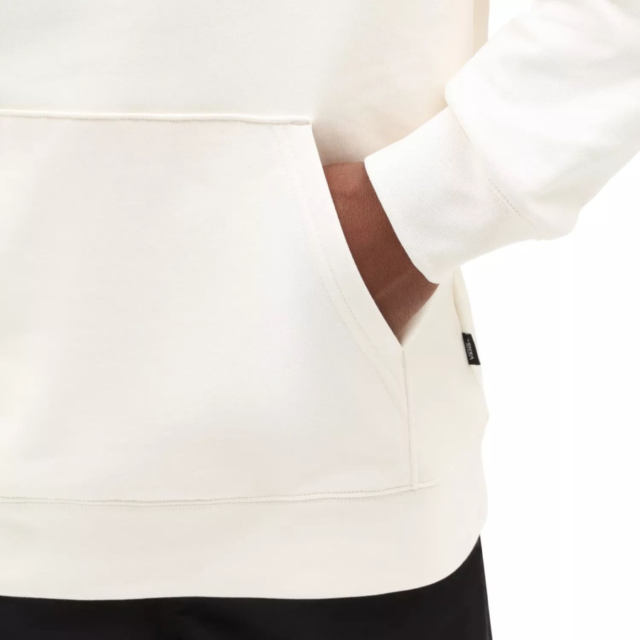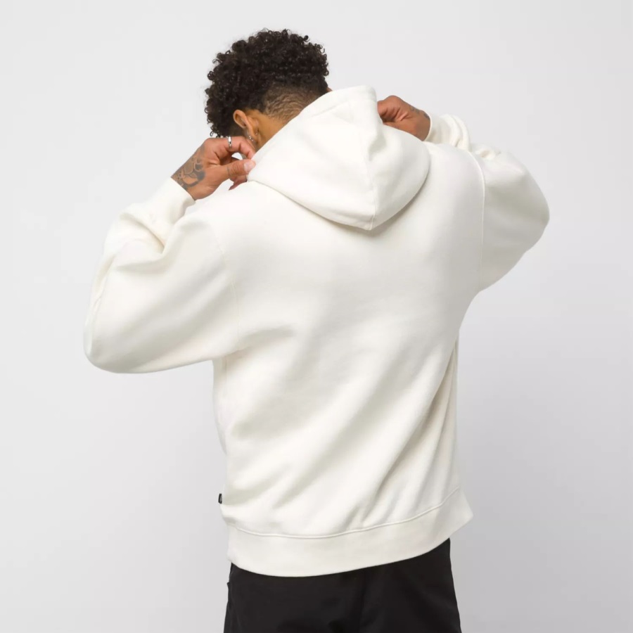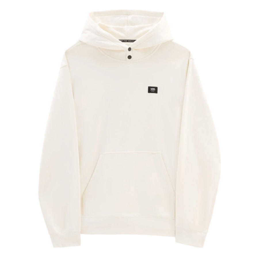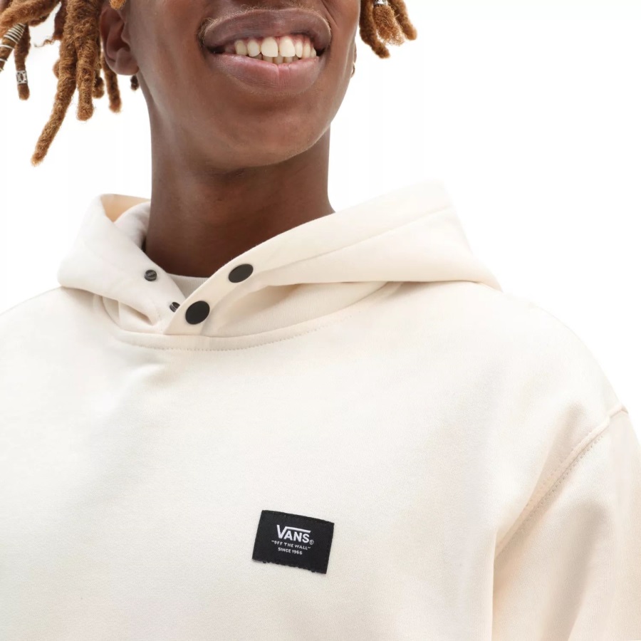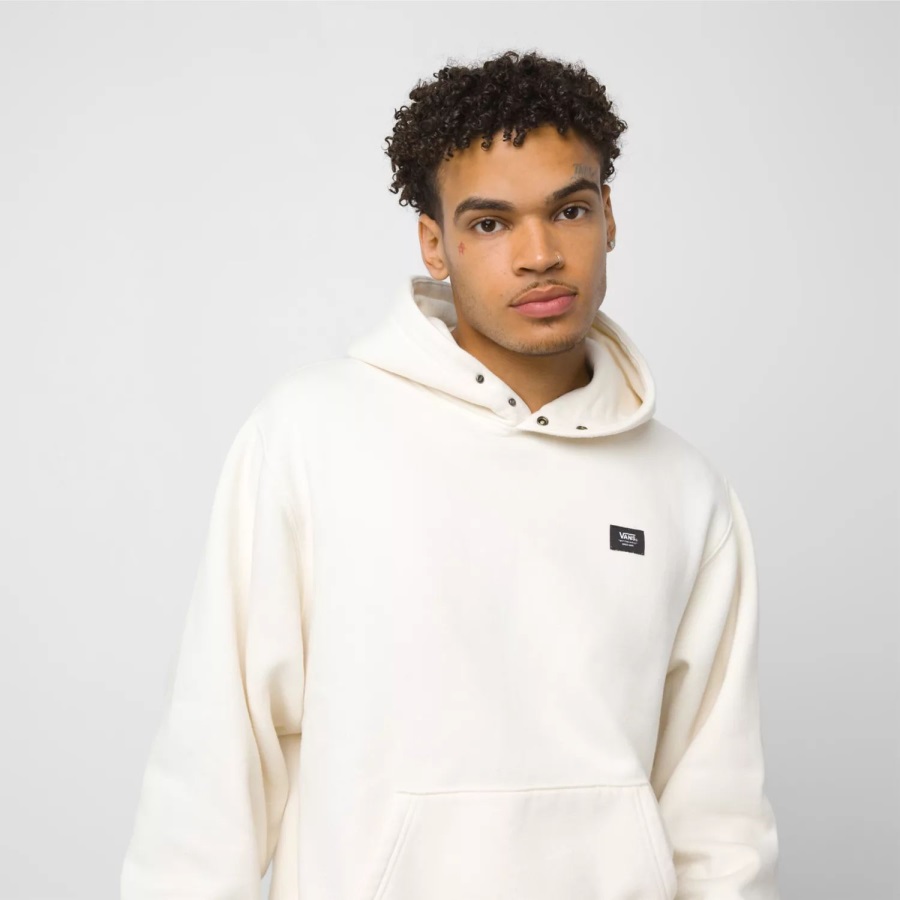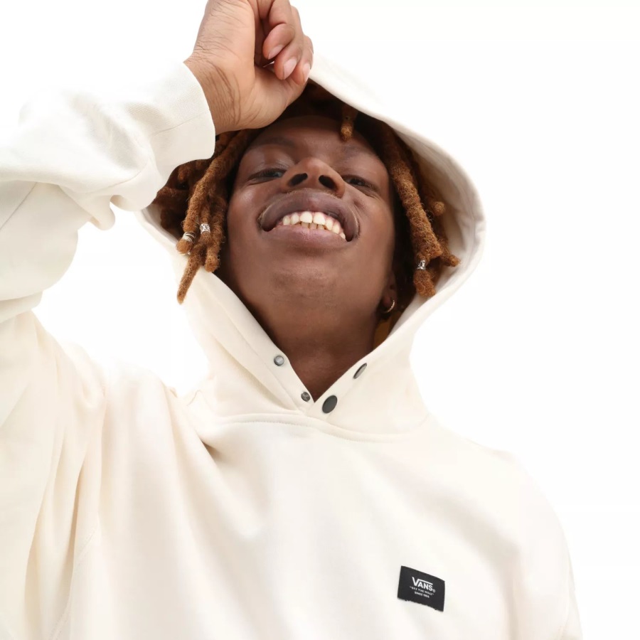 Featuring snaps instead of a drawcord at the hood, the Snap Hood Pullover is a soft fleece pullover sweatshirt with a front pouch pocket and a workwear-inspired woven logo label at left chest. This versatile white hoodie is made with 60% cotton and 40% polyester fleece.