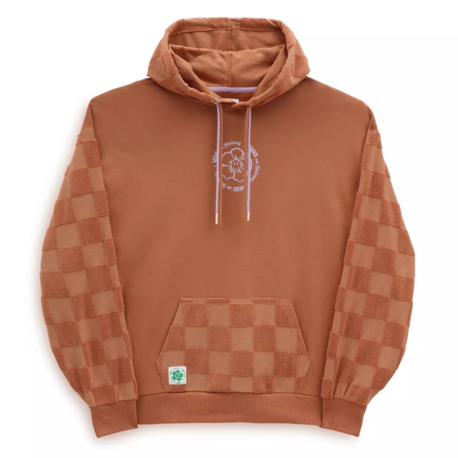 This season, Vans and Sydney-based label Emma Mulholland on Holiday have partnered to create a head-to-toe capsule that extends your summer vacation glow. This collection has a playful spirit that encourages you to experiment, have fun, and not take yourself too seriously.Blending materials and graphics for a unique take on the classic hooded sweatshirt, the EM On Holiday Hoodie keeps the vacation vibes coming. A checkerboard jacquard terrycloth is used at the sleeves, hood, and front pouch pocket, while the body of this oversized sweatshirt utilizes a cozy brushed back fleece. Novelty double drawcords with metal aglets and center front embroidery add to the elevated design.