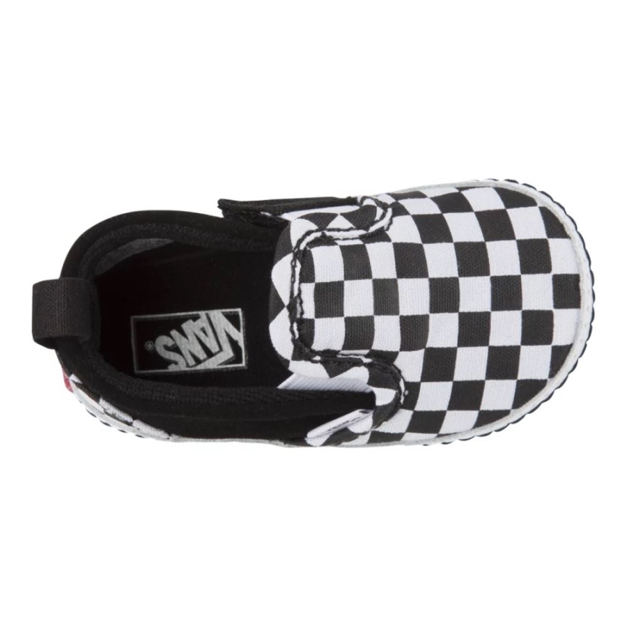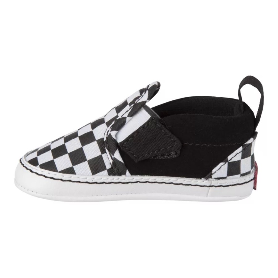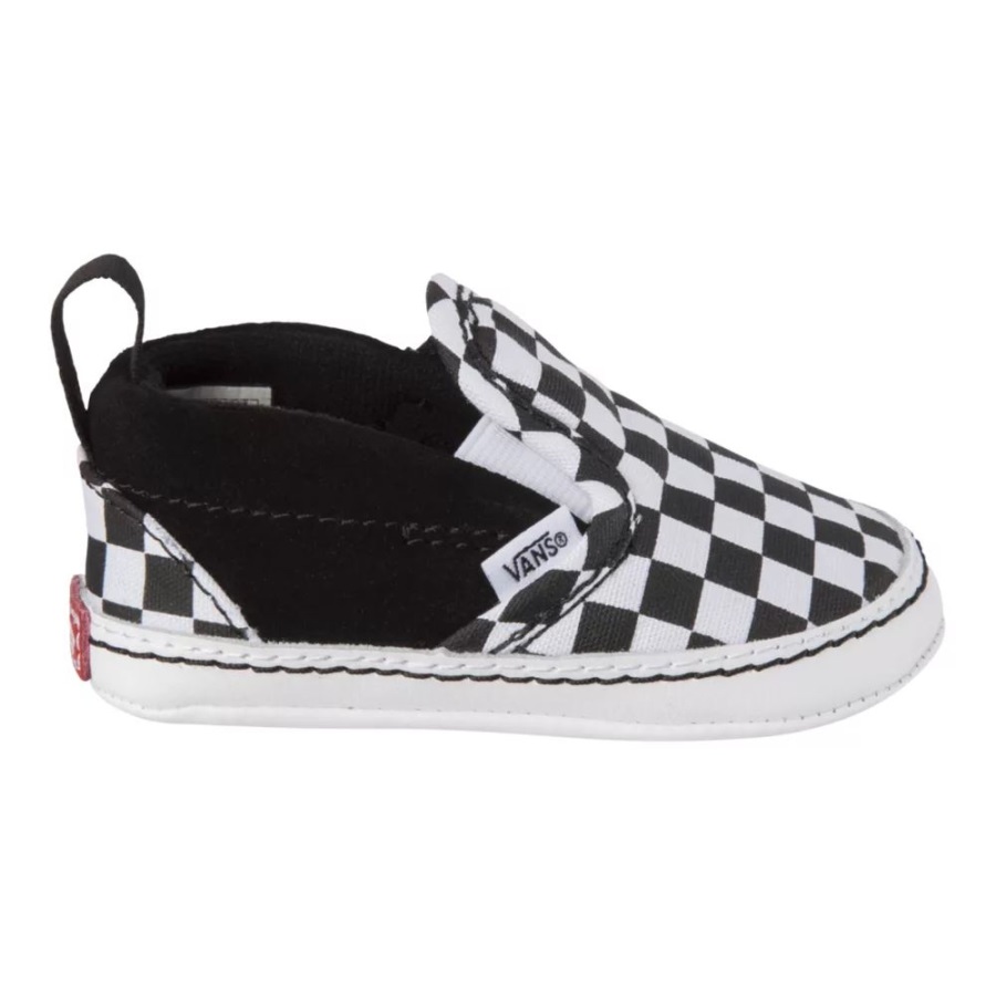 The Slip-On V Crib, redesigned for a perfect fit in the style of the original Slip-On, features suede and textile uppers, elastic side accents, and heel pulls for an easy on-and-off fit. A new print on the outsole mimics the iconic Vans waffle sole, and the addition of a Vans heel scab completes the classic look.