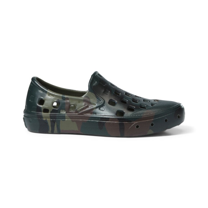 Taking the Classic Slip-On silhouette to a whole new level, the Camo Slip-On TRK combines all the Vans DNA that you know and love with a durable, single piece injected construction, deconstructed checkerboard drainage holes for breathability, and an oversized reverse waffle sole for incredible traction in any situation. Designed to be lightweight and fully rinseable, the Camo Slip-On TRK is easy to pack for your next adventure, so you can slip-on and on and on… - BIG-TIME TRACTION - Improved traction for any situation, thanks to the oversized reverse waffle sole. - BREATHABLE AND RINSABLE - Drainage holes mean that whatever goes in goes right back out. - A ONE-PIECE, SOLID, DURABLE DESIGN - A single-piece injected construction makes the Slip-On TRK collapsible and packable, as well as durable. - CAMOUFLAGE PRINT - The allover camouflage print enhances the "Off The Wall" look of this heritage-inspired shoe.
