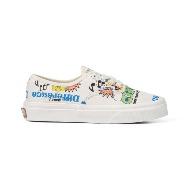 As an initial step in our journey towards sustainability, the Kids Eco Theory Authentic is made with 50% recycled cotton and 50% hemp, and features an allover print reminding us to care for the earth, because its the only one weve got. Along with a responsibly sourced natural rubber outsole that still maintains the grip and durability that Vans has been known for since 1966, this iconic lace-up shoe includes metal eyelets and renewable jute laces. - RECYCLED AND SUSTAINABLE MATERIALS: The upper materials are made with 50% recycled cotton and 50% hemp. - NEW NATURAL RUBBER COMPOUND: This all-new Vans Rubber Compound is made from responsibly sourced natural rubber (instead of petroleum derived synthetic rubber) obtained from sources that follow proven ethical and sustainable practices that minimize harm and have positive benefits within the natural and social ecosystems in which they operate. This new natural rubber compound was developed and engineered to maintain the grip and durability that Vans has been known for since 1966. - JUTE LACES: This natural fiber is grown with minimal water and is considered a fast growing renewable crop.