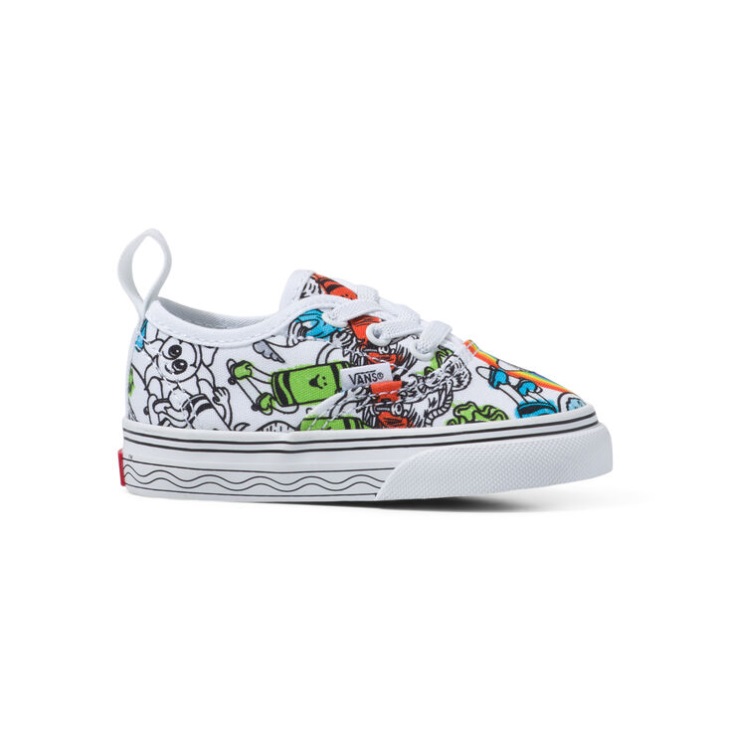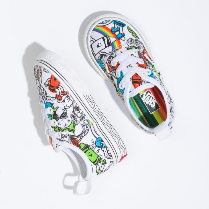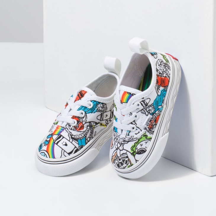 Encouraging your little one to explore their creative side, the Toddlers Crayola Authentic Elastic Lace features sturdy textile uppers that mimic a coloring book, waiting to be filled in. This clever twist on our original lace-up Authentic also features elastic laces and pull tabs at the heels, allowing for an easy on-and-off fit. - Vans x Crayola collection - Vans original low top shoe updated for kids - Elastic laces and heel pull tabs for easy on-and-off - Sturdy textile uppers - Allover print encouraging DIY coloring - Metal eyelets - Signature rubber waffle outsoles