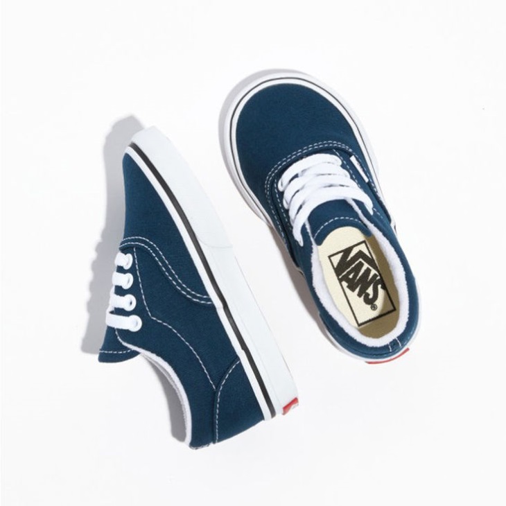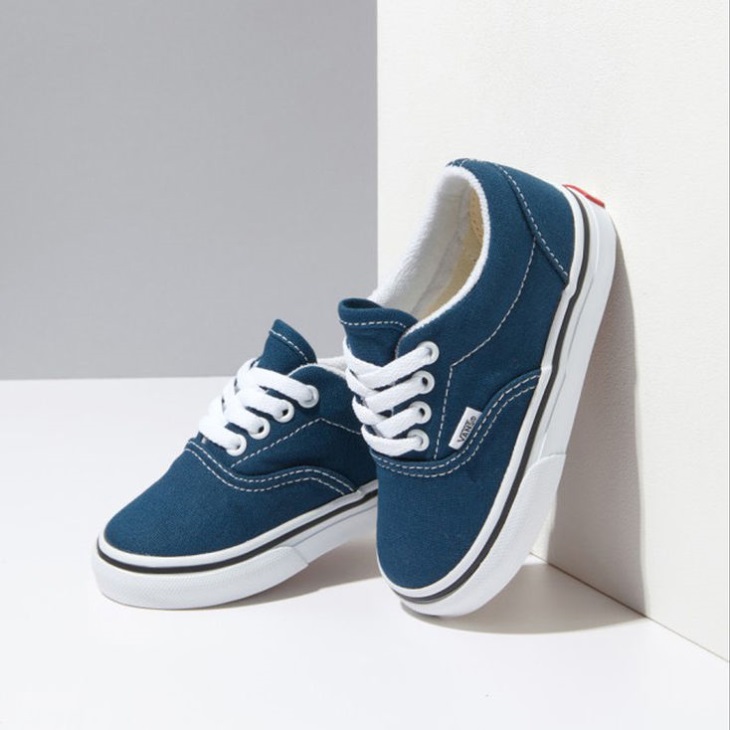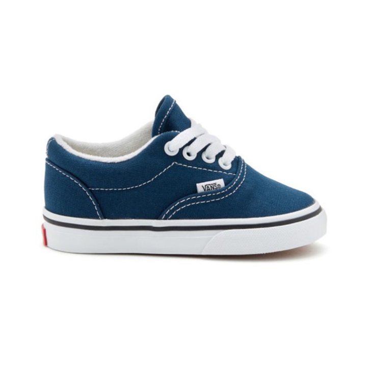 The Era, the Vans classic low top skate shoe, features sturdy canvas uppers with metal eyelets, padded collars for support and flexibility, and signature rubber waffle outsoles.