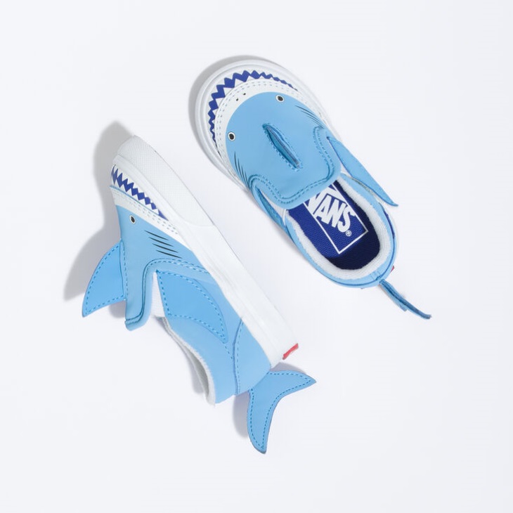 Made with low profile synthetic uppers, the Slip-On V Shark also includes side hook-and-loop closures and heel pulls to give small feet a better fit, and provide even easier on-and-off access. This little kid-friendly shoe is finished with supportive padded collars, durable toe caps, elastic side accents, and signature rubber waffle outsoles. - Vans' iconic slip-on shoe made for toddlers - Unique details that bring sharks to life - Side hook-and-loop closures - Heel pull tabs - Low profile synthetic uppers - Supportive padded collars - Elastic side accents - Signature rubber waffle outsoles