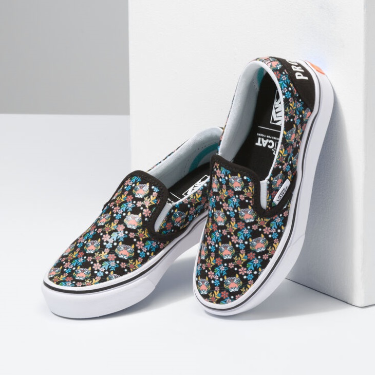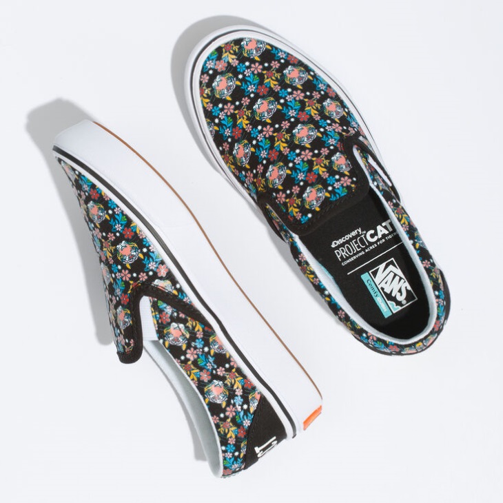 The Roar of the Tiger is fading from our planet, and Discovery is committed to bringing it back. Celebrating these creatures that make our planet extraordinary, Vans and the Discovery Channel have partnered for a collection that supports Project CATs mission of ensuring a healthy habitat for future generations of tigers. Embodying the tigers fiery, Off The Wall spirit, the Vans X Project CAT Kids ComfyCush Slip-On features a colorful, allover floral tiger print inspired by the majestic orange cat we all love. To tie into our shared passion, weve embroidered Project CATs goal across the heel: Protect Tigers. Made with textile uppers and ComfyCush technology, this upgraded slip-on shoe also includes a co-molded construction of foam and rubber for comfort, rubber outsoles offering durability and traction, simplified one-piece interiors with added arch support, and moisture-wicking lining materials throughout the interior of the shoe. No animal products were used in this collection. In connection with this collaboration, Vans and Discovery will be donating $20,000 directly to the World Wildlife Fund, because we must support the creatures that cant stand up for themselves. -Vans x Project CAT collection -Allover floral tiger print -Protect Tigers embroidered across the heels -Sturdy textile uppers -ComfyCush construction for comfort -Rubber outsoles offer durability and traction -Simplified one-piece interiors with added arch support -Moisture-wicking lining materials -No animal products