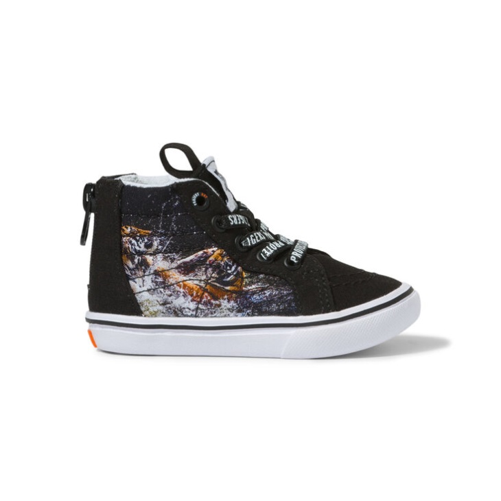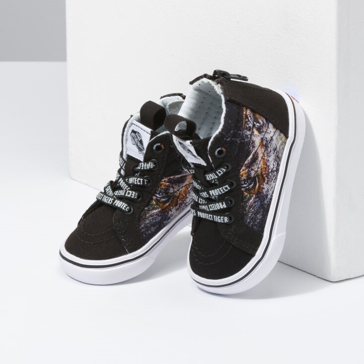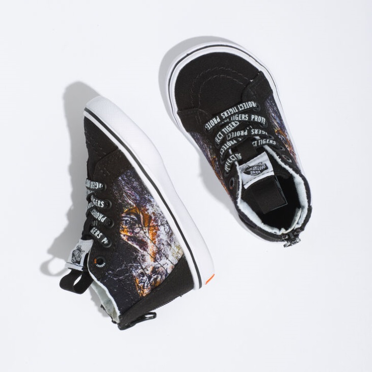 The Roar of the Tiger is fading from our planet, and Discovery is committed to bringing it back. Celebrating these creatures that make our planet extraordinary, Vans and the Discovery Channel have partnered for a collection that supports Project CATs mission of ensuring a healthy habitat for future generations of tigers. Embodying the tigers fiery, Off The Wall spirit, the Vans X Project CAT Toddler ComfyCush Sk8-Hi Zip features a print that showcases tigers in the wild, and across the laces, weve highlighted Project CATs goal: Protect Tigers. Made with organic textile uppers and ComfyCush technology, this upgraded high top shoe includes a co-molded construction of foam and rubber for comfort, rubber outsoles offering durability and traction, simplified one-piece interiors with added arch support, and moisture-wicking lining materials throughout the interior of the shoe. A zipper entry at the heel offers increased access and versatility. No animal products were used in this collection. In connection with this collaboration, Vans and Discovery will be donating $20,000 directly to the World Wildlife Fund, because we must support the creatures that cant stand up for themselves. -Vans x Project CAT collection -Wild tiger print and printed laces -Sturdy organic textile uppers -Heel zipper entry -ComfyCush construction for comfort -Rubber outsoles offer durability and traction -Simplified one-piece interiors with added arch support -Moisture-wicking lining materials -No animal products