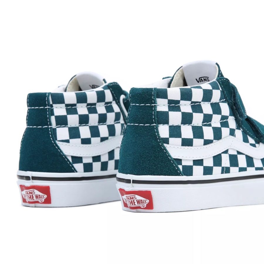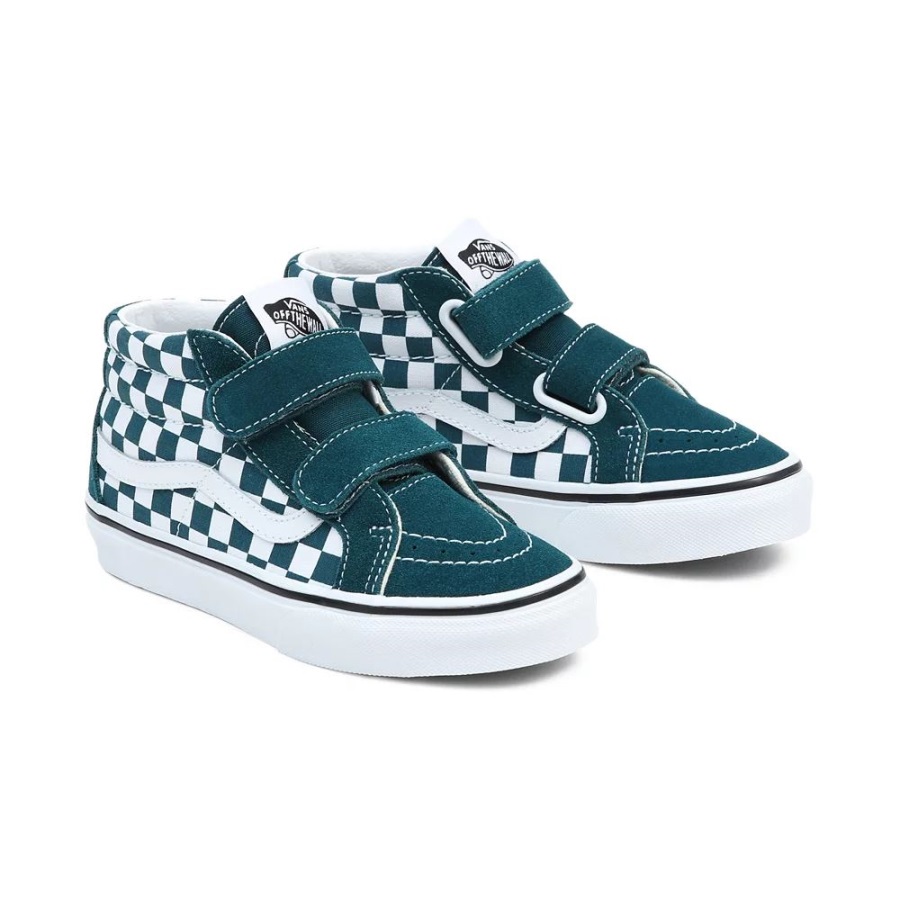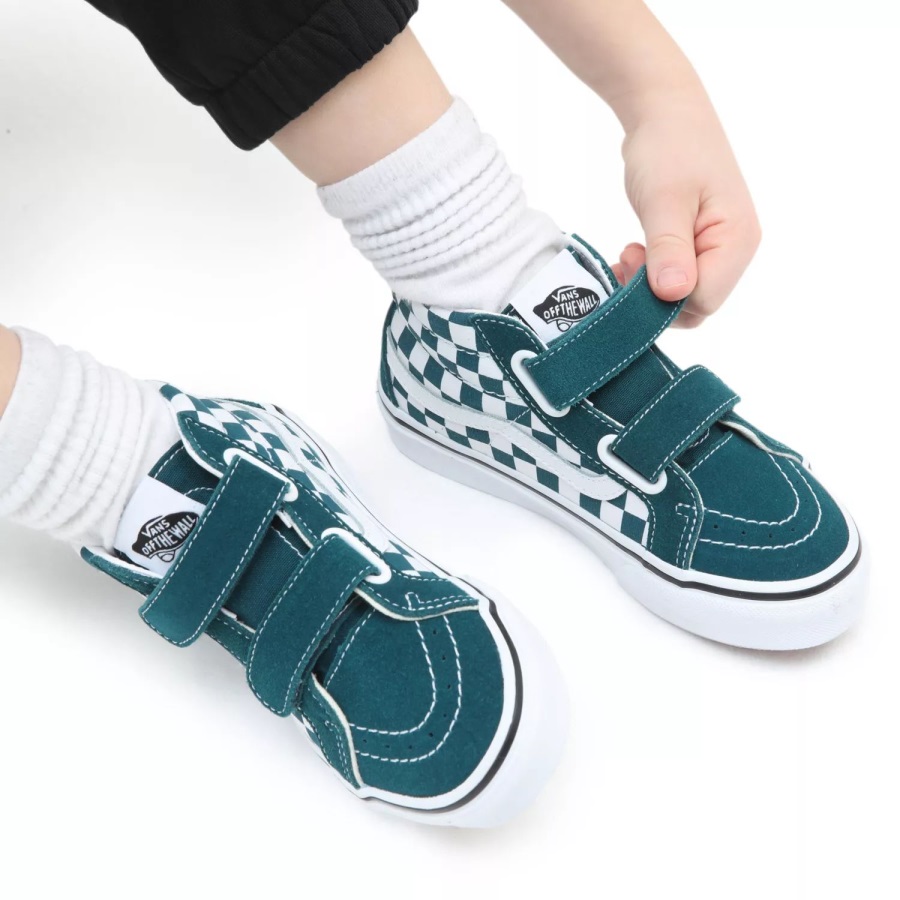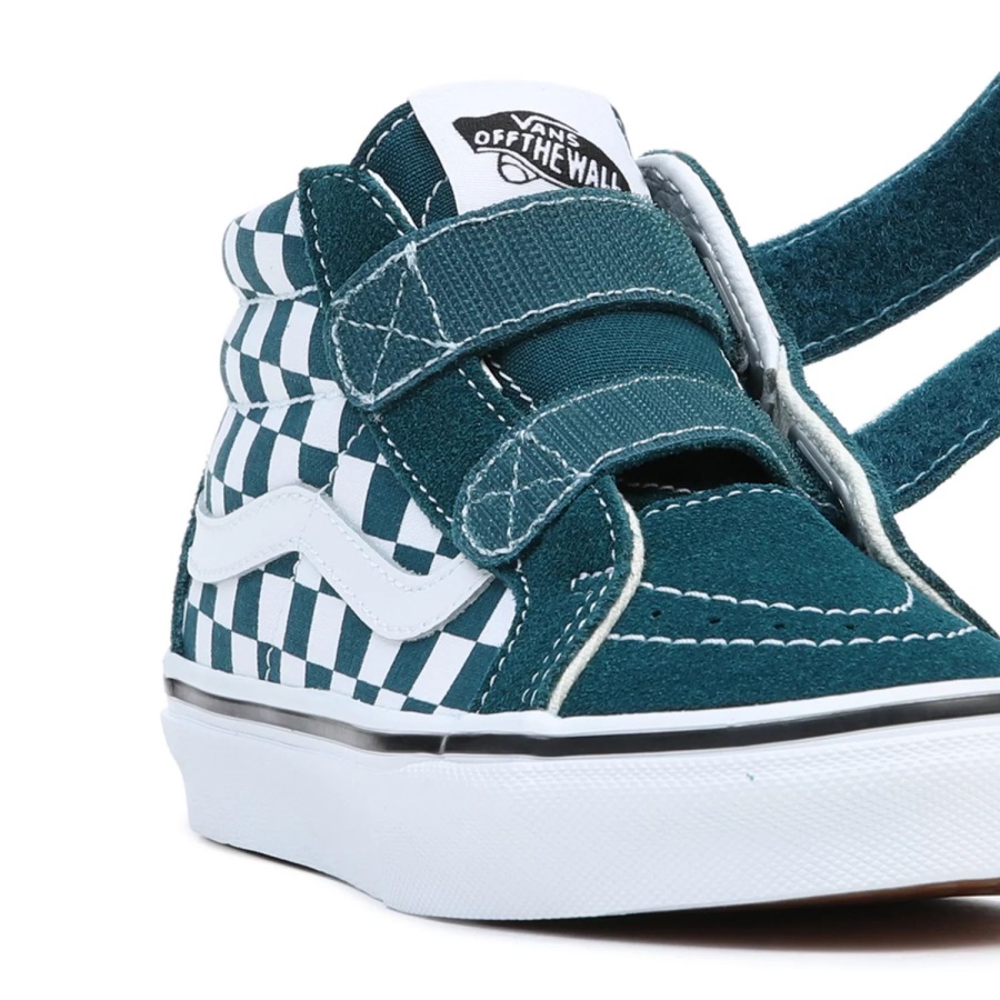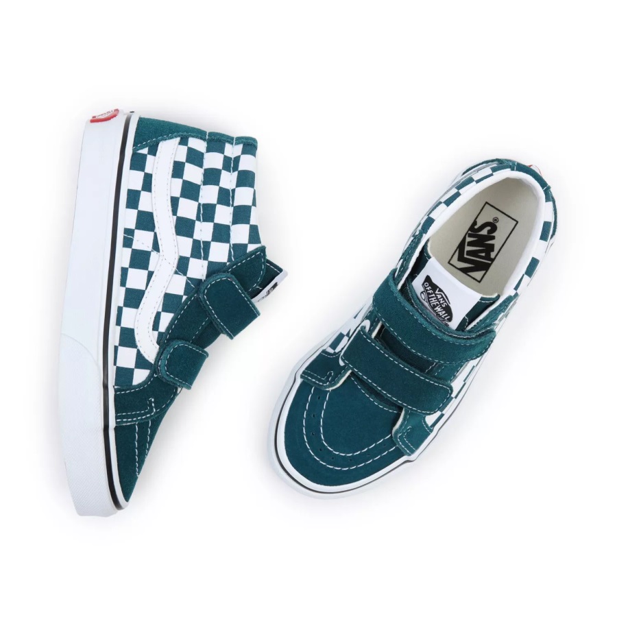 The Color Theory Collection allows you to create a unique color story by pairing vibrant, unexpected hues with our iconic footwear silhouettes. Made with sturdy suede and canvas uppers featuring our signature checkerboard print, the Color Theory Sk8-Mid Reissue V honors our reissued mid top shoe with eye-catching colorways ideal for the season. Along with double hook-and-loop closures instead of traditional laces, this timeless sidestripe style also includes re-enforced toe caps, supportive padded collars, and signature rubber waffle outsoles.