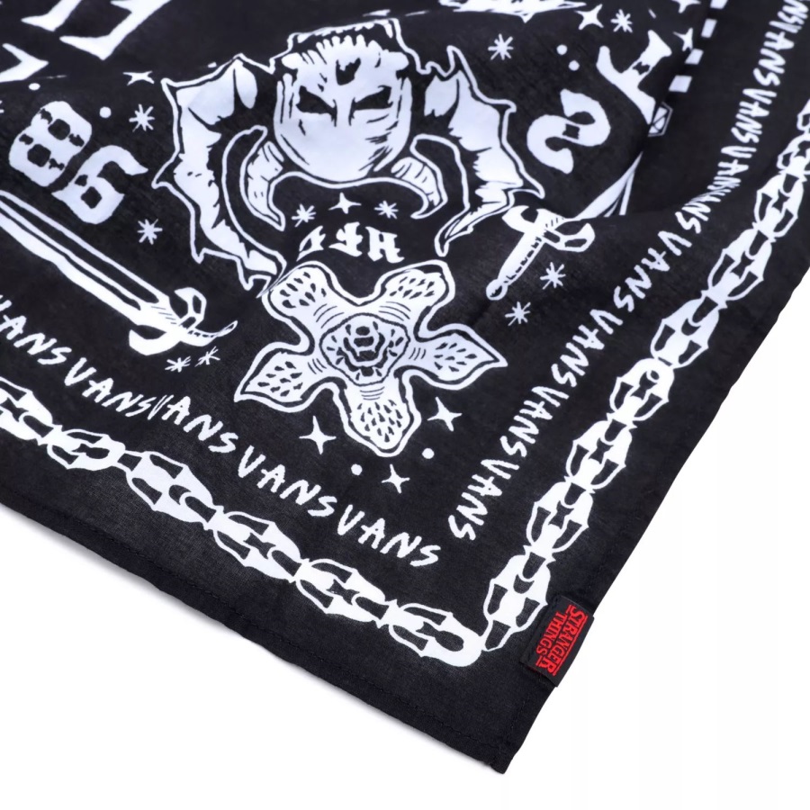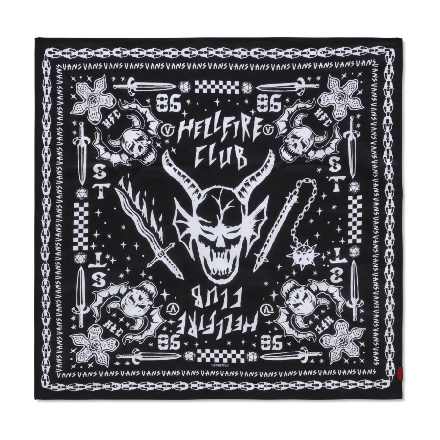 The Vans X Stranger Things 4 collection brings the Stranger Things world to life. Travel to the Upside Down, Surfer Boy Pizza, Hawkins Indiana, and more through Vans' playful apparel and footwear.The Vans X Stranger Things HFC Bandana features classic black and the Hellfire Club logo. It also has D&D dice graphics, swords, a horned demon stamp and subtle imagery that offers more nods to the show. Just grab your group of best friends, and get ready to be propelled into the world of Vans X Stranger Things 4.