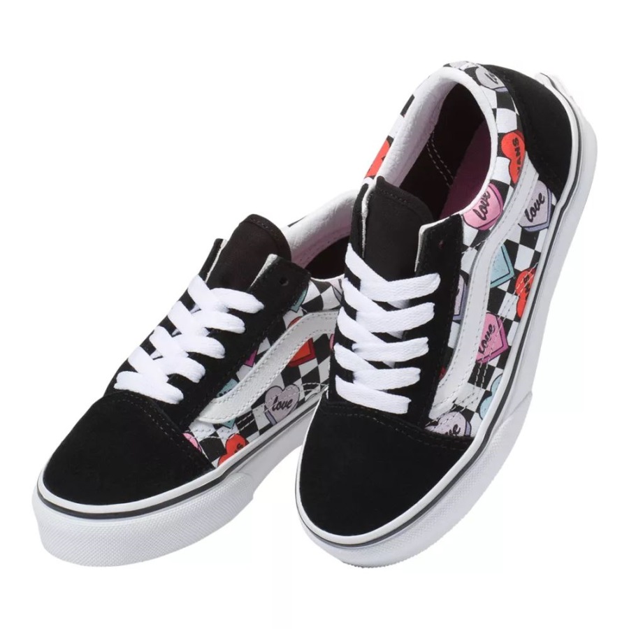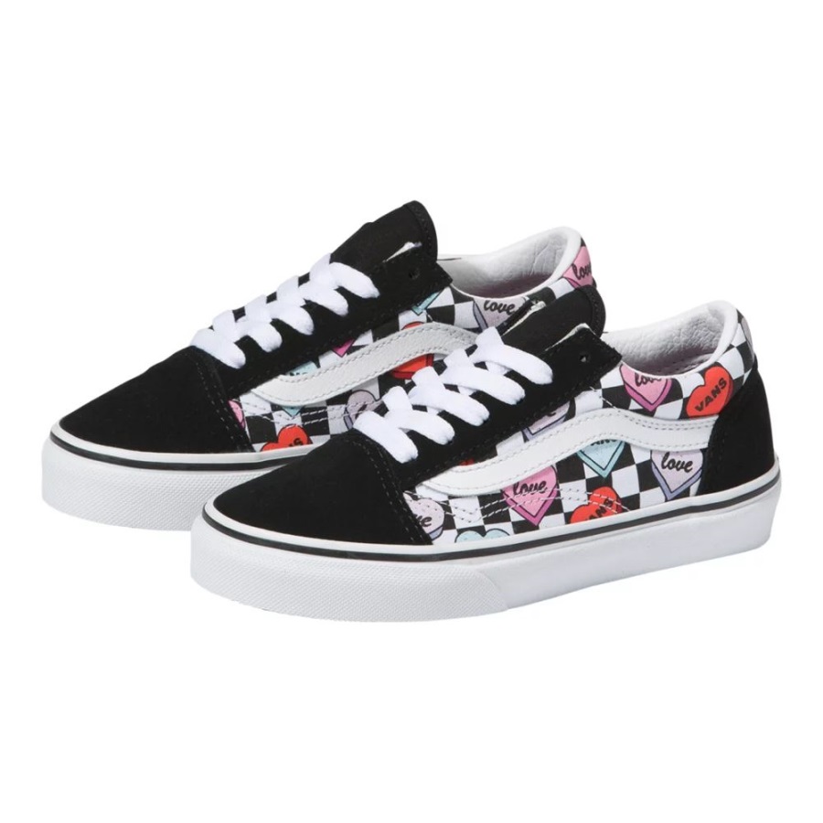 First known as the Vans #36, the Old Skool debuted in 1977 with a unique new addition: a random doodle drawn by founder Paul Van Doren, and originally referred to as the "jazz stripe." Today, the famous Vans Sidestripe has become the unmistakable—and instantly recognizable—hallmark of the Vans brand.Featuring a checkerboard and heart print inspired by the iconic Valentine's Day candy, the Kids Candy Hearts Old Skool pays homage to Vans' heritage while ensuring that this low top, lace-up shoe remains as iconic as ever. It also includes durable suede and canvas uppers, re-enforced toe caps, supportive padded collars, and signature rubber waffle outsoles.