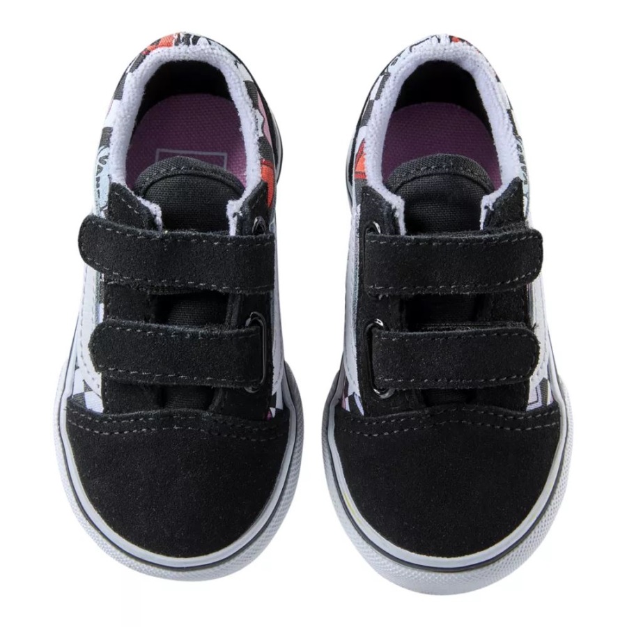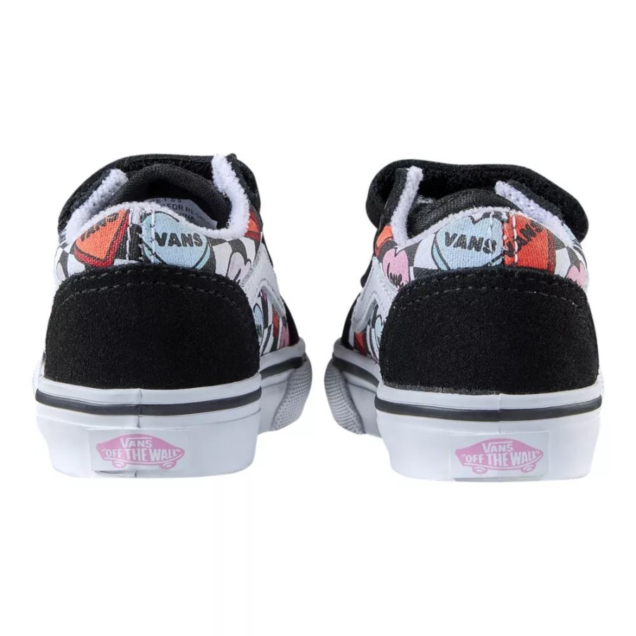 The Toddler Candy Hearts Old Skool V reimagines Van's iconic sidestripe shoe by swapping traditional laces for double hook-and-loop closures. Featuring a checkerboard and heart print inspired by the iconic Valentine's Day candy, this low top style maintains its classic appeal while providing an easy, secure fit that will keep your little ones comfortable all day. The Toddler Candy Hearts Old Skool V also includes durable suede and canvas uppers, re-enforced toecaps, supportive padded collars, and signature rubber waffle outsoles.