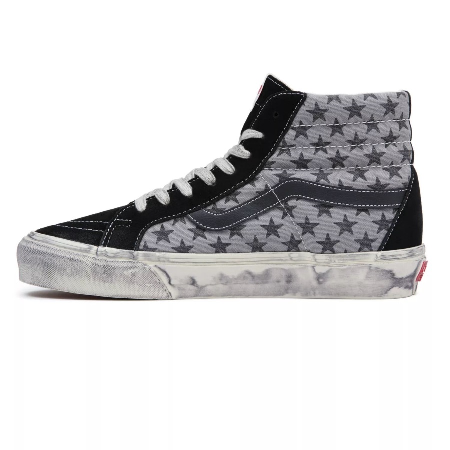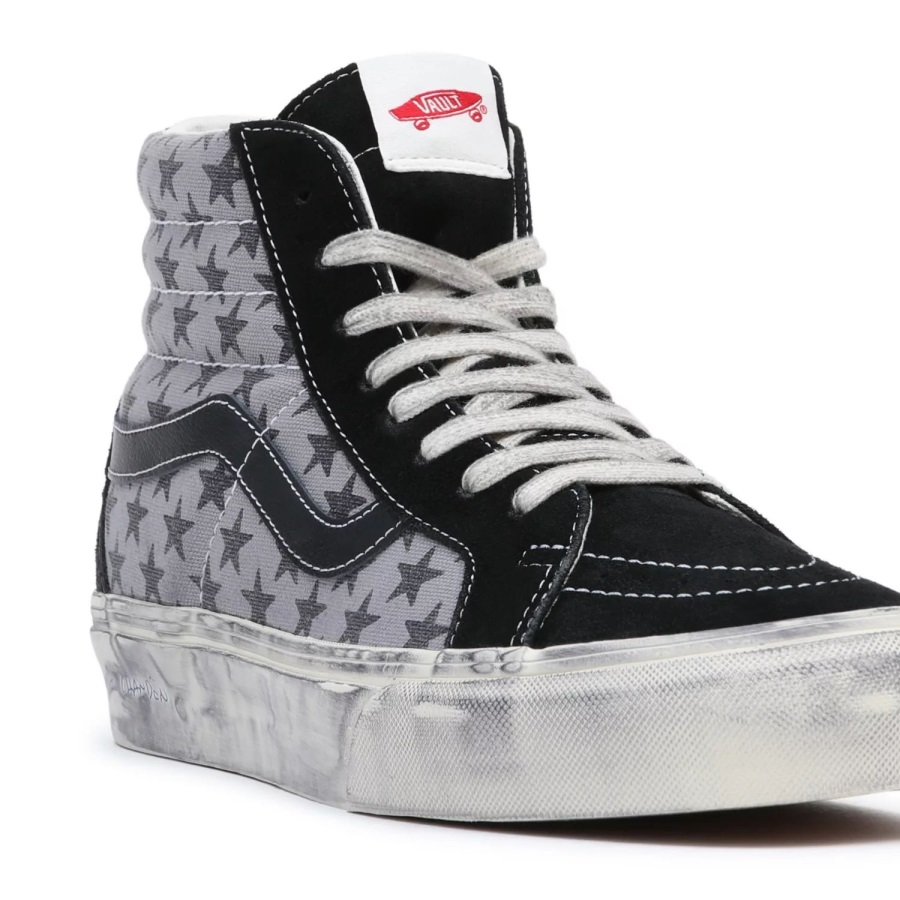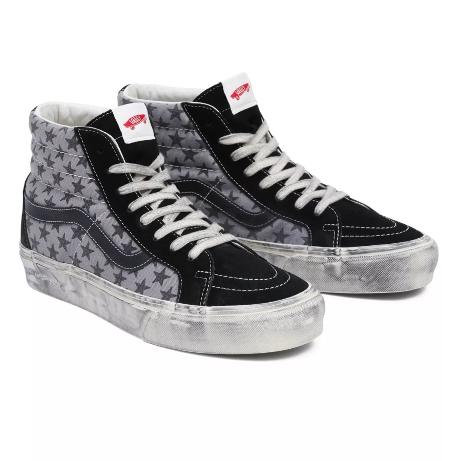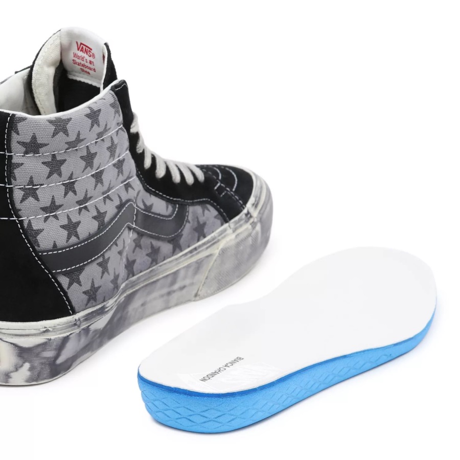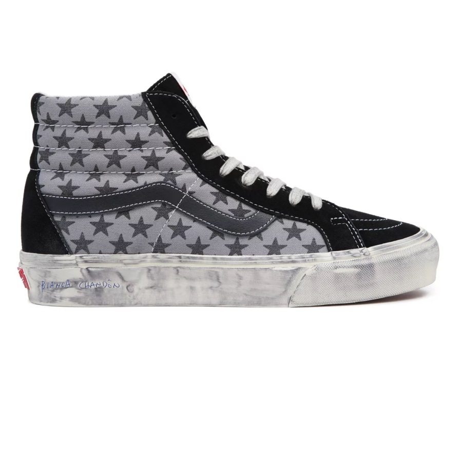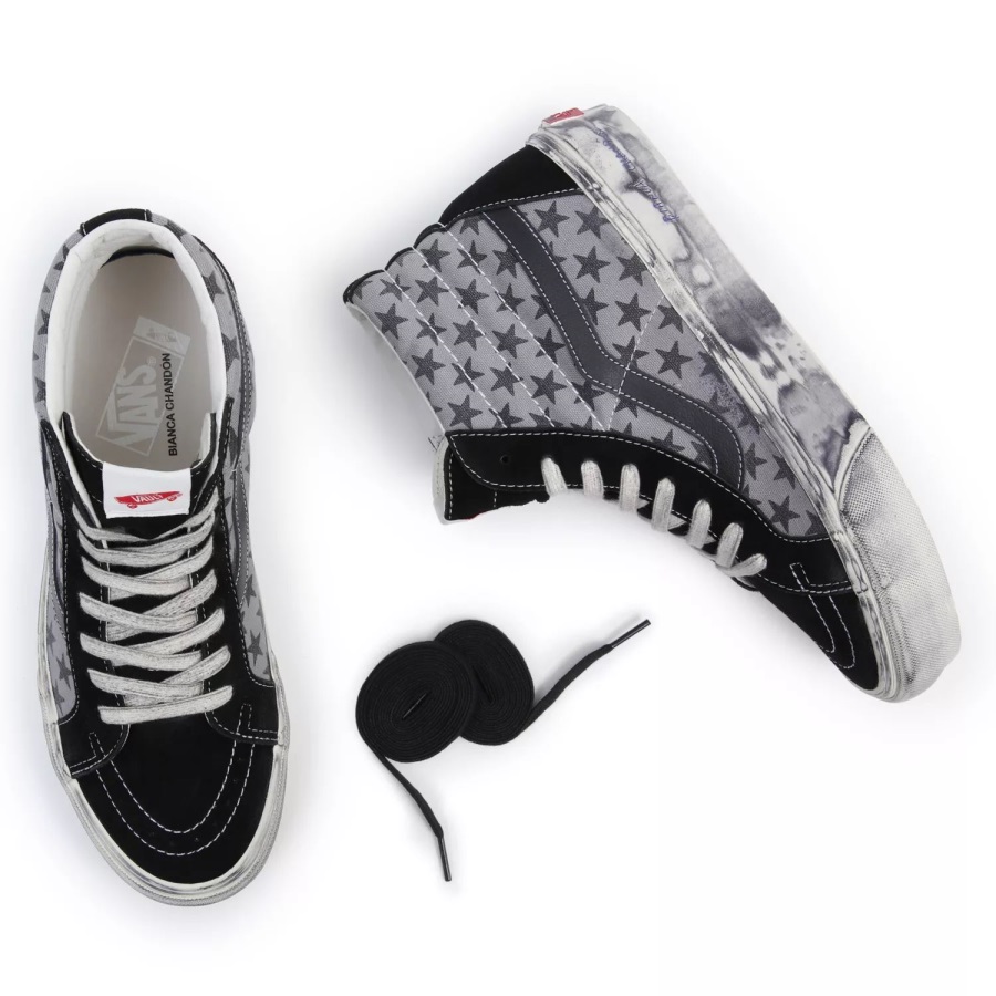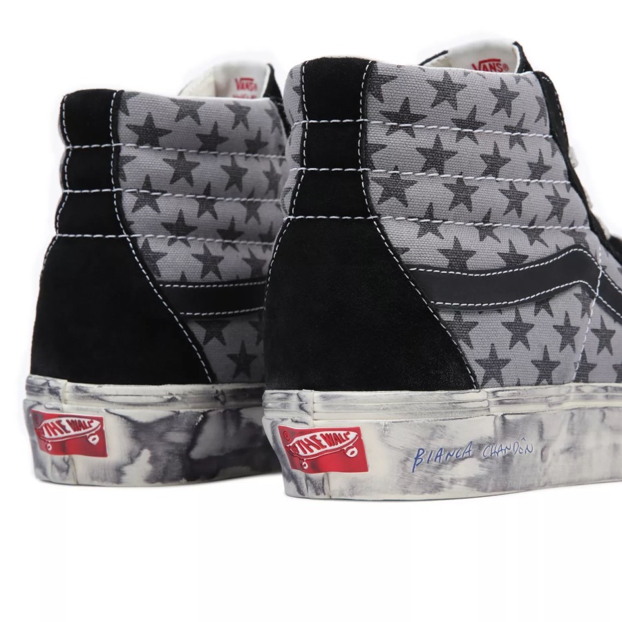 Bianca Chandôn was founded in 2013. With skate culture making its way deeper into the fashion spotlight.Bianca Chandôn is named after Bianca Jagger and Chandôn, which itself was inspired by French race car driver Olivier Chandôn-two cultural icons of the late 1970s and early 1980s. Inspired by these eras and vintage Americano Vans patterns, the Bianca Chandôn Sk8-Hi Reissue was designed to give the shoe a true DIY skate vibe and recreate the iconic worn aesthetic.Sturdy suede and washed canvas with a repeated star pattern reinforce the timeless vibe of this high top shoe, while a ball point signature on the sidewall offers a subtle stroke of Bianca Chandôn branding. Finally, for an added nod to how great Vans look slightly thrashed, the uppers and sidewalls were hit with a greasing treatment by hand to provide a true broken-in look and feel. The custom packaging and footbeds add another unique touch to this elevated silhouette.