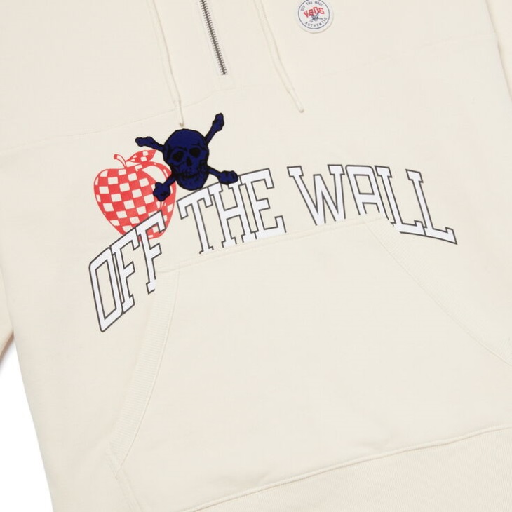 The New Varsity Quarter Zip Hoodie is a 70% cotton 30% polyester hoodie sweater with a top-down chest zip, a large kangaroo pocket and a skull-cherry Off The Wall front logo design.