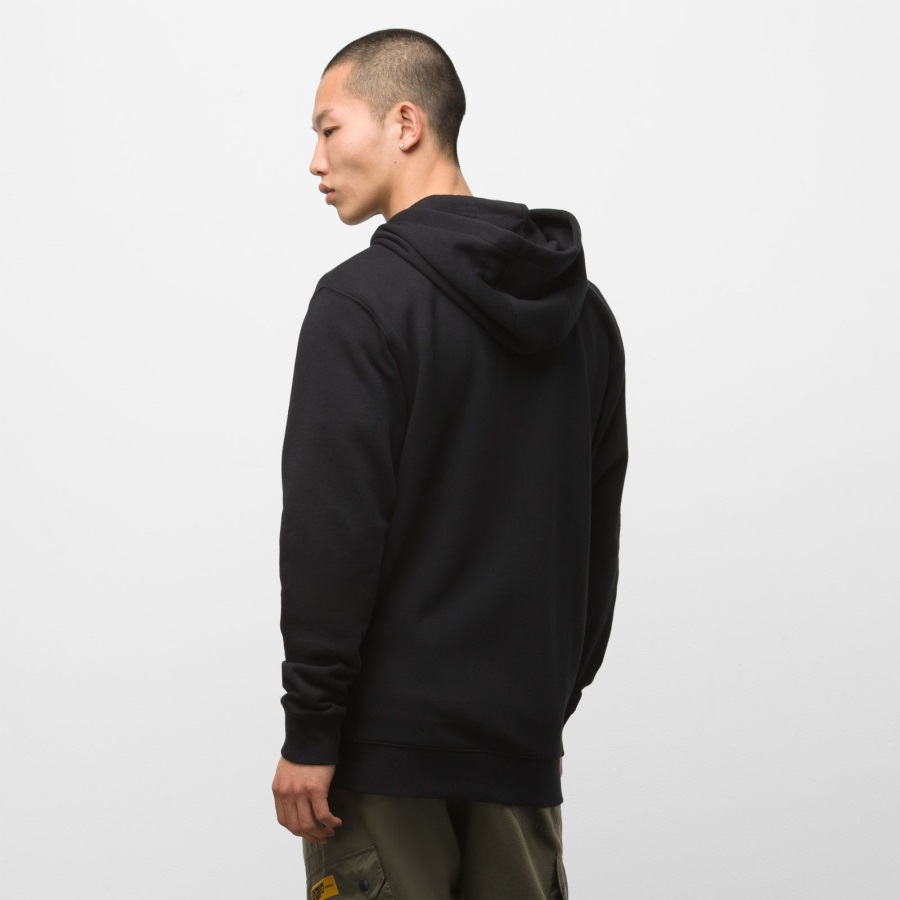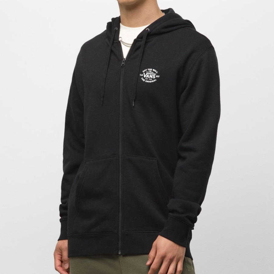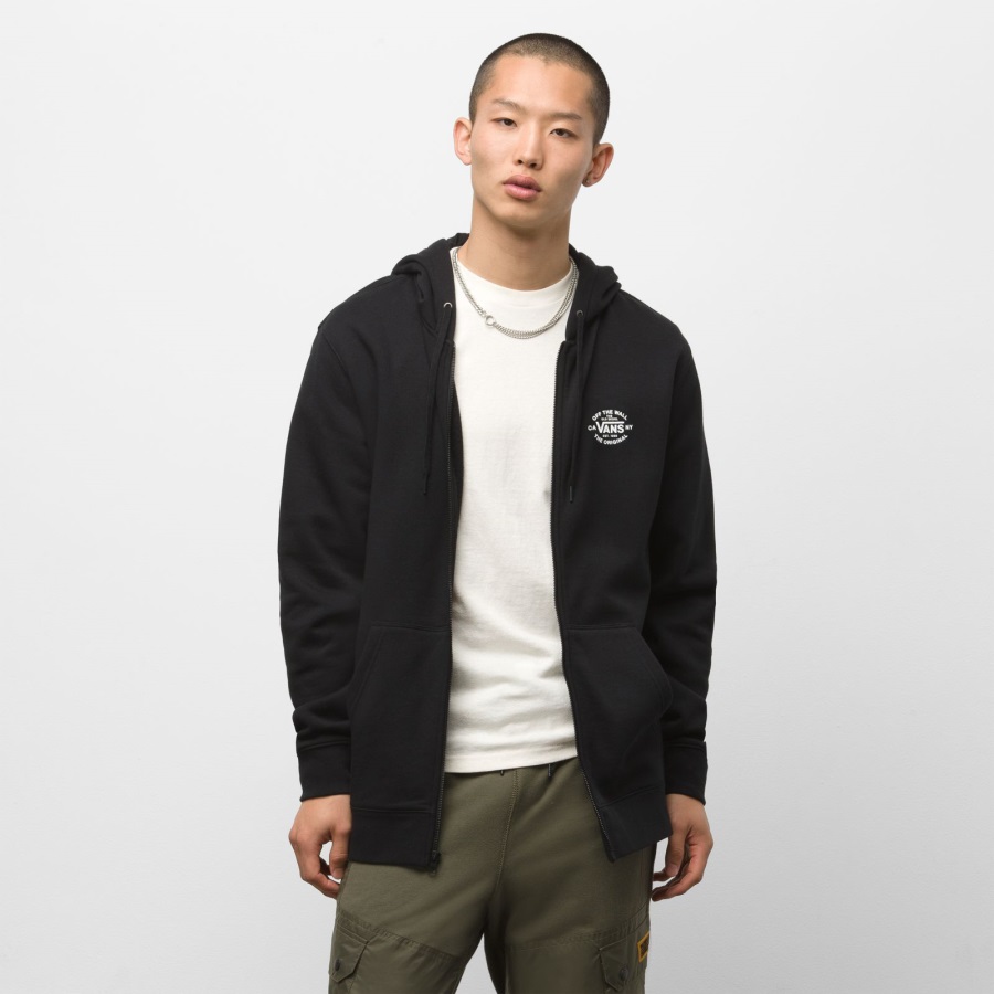 The Seasonal Full Zip Hoodie is a 60% cotton, 40% polyester fleece hooded sweatshirt with a full zip, front hand pockets, and a left chest logo screen print. James Baek (He/ Him) is 6' 0" tall and is wearing a size M top & size 32 bottom.