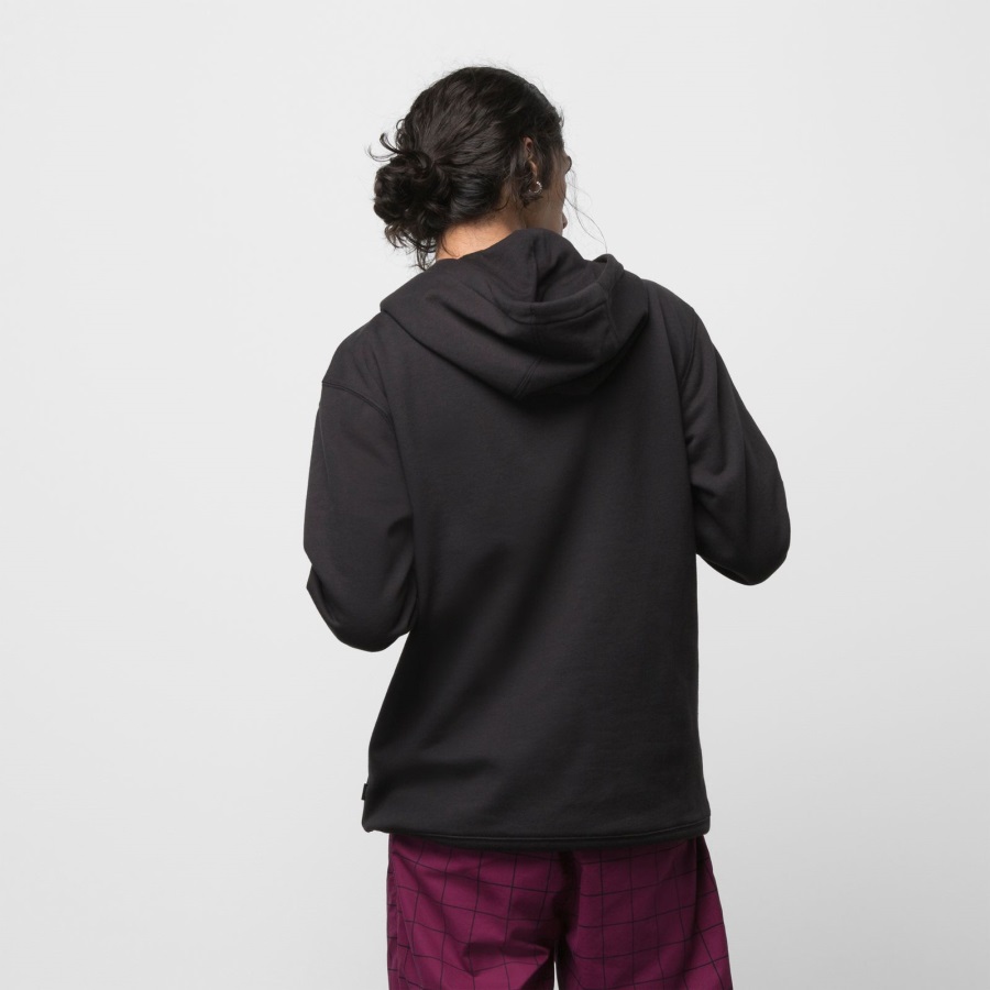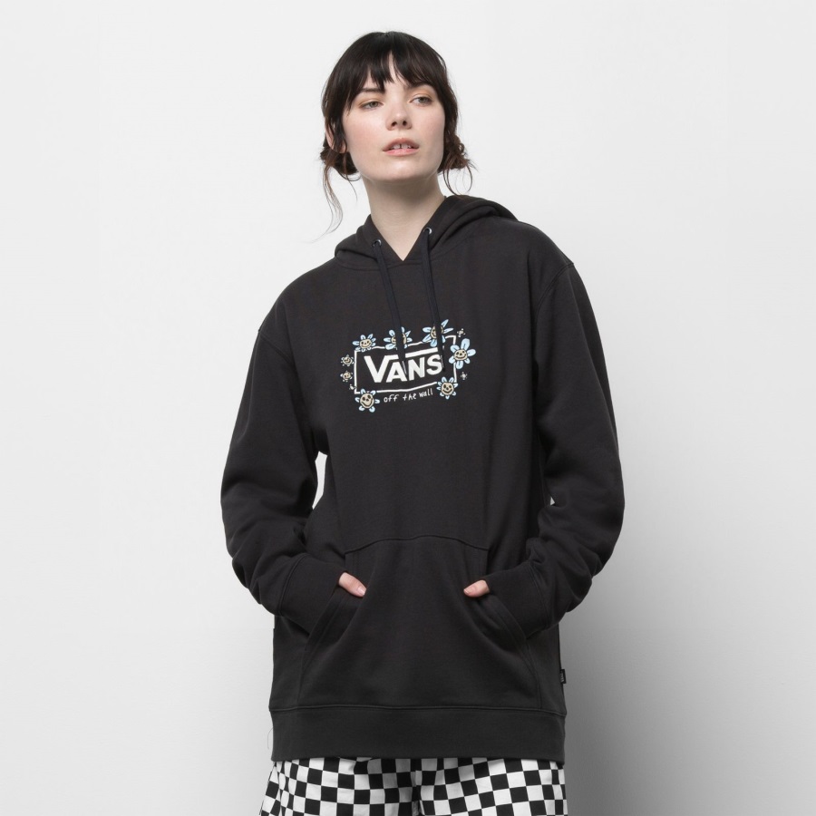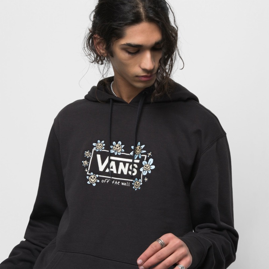 The Trippy Grin Pullover is a 60% cotton, 40% polyester fleece pullover hooded sweatshirt with a front pouch pocket and classic boxed logo embroidery surrounded by trippy floral artwork. Model is 6 feet tall and wearing a size Medium.