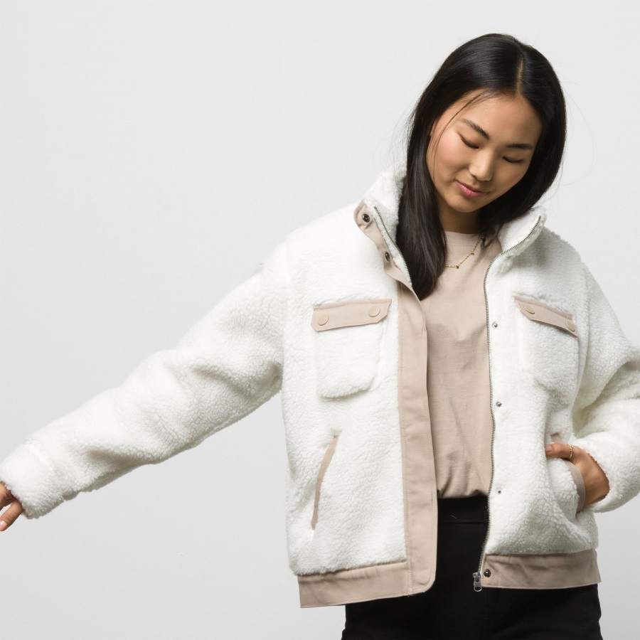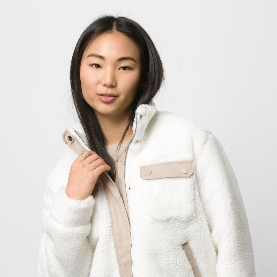 A perfect addition to your cold weather rotation, the Cozy Sherpa Jacket features contrasting cotton canvas details at the placket and pockets and an extended collar for an even more snug feel. Along with a hidden zip closure and simple logo patch at the left chest pocket, this Sherpa jacket has a comfortable relaxed fit. Model is 5 feet 9 inches tall and wearing a size Small.