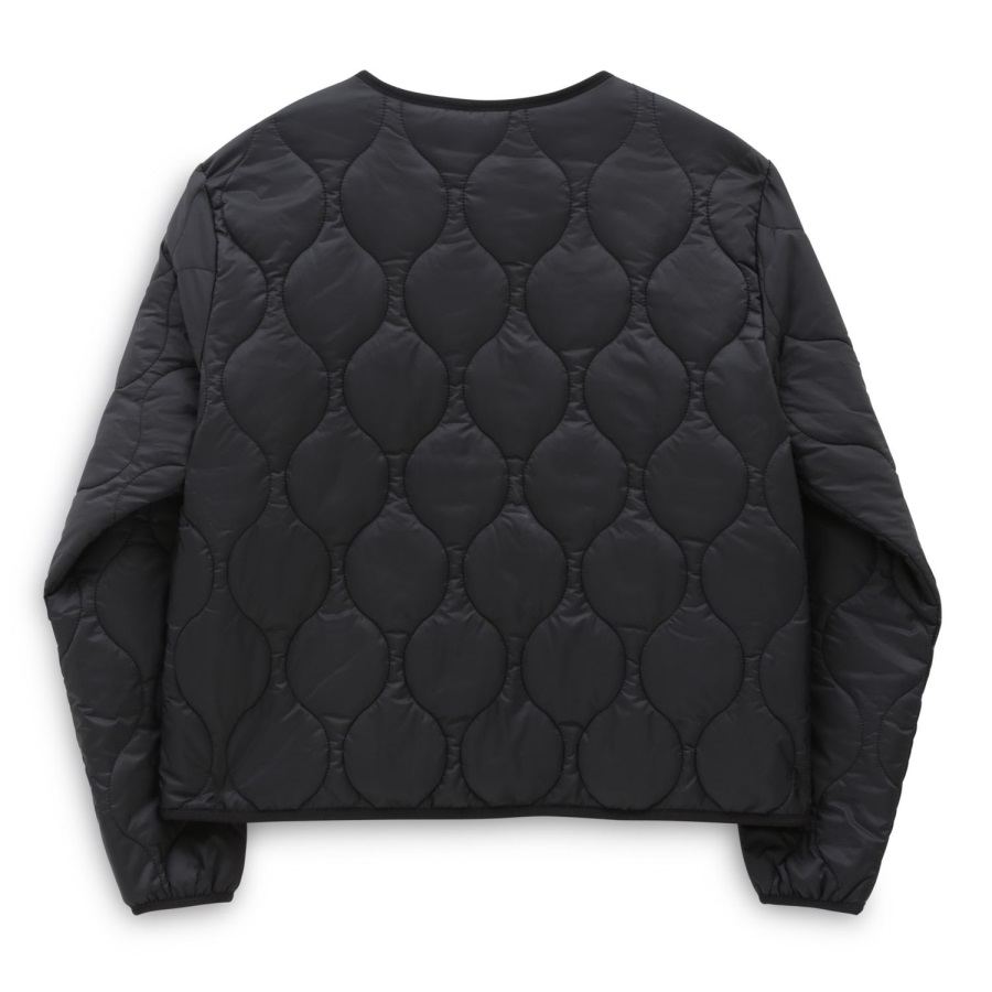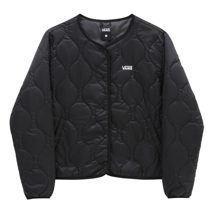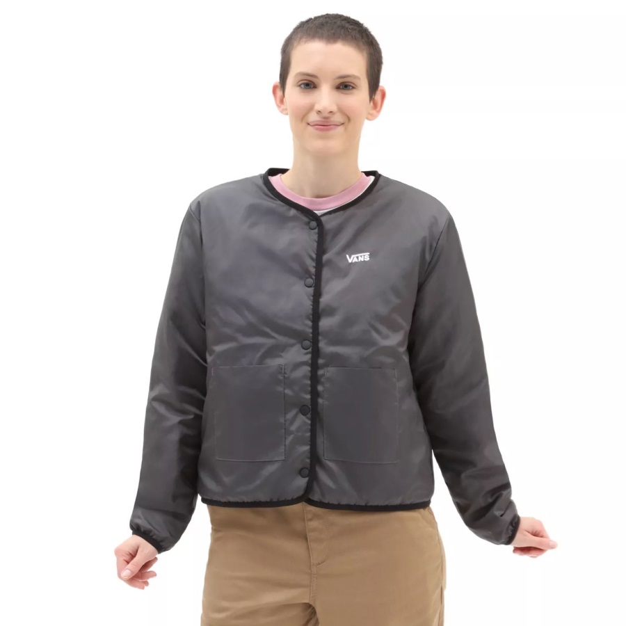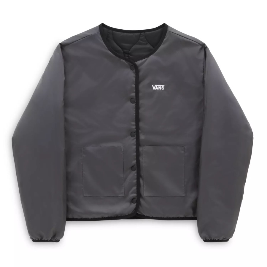 The Forces Short Rev Liner Jacket is a relaxed fit reversible liner jacket with onion quilting and 3 oz fill for extra comfort and warmth. There are pockets at the front, elastic trim detail, and the Vans logo on the left chest.
