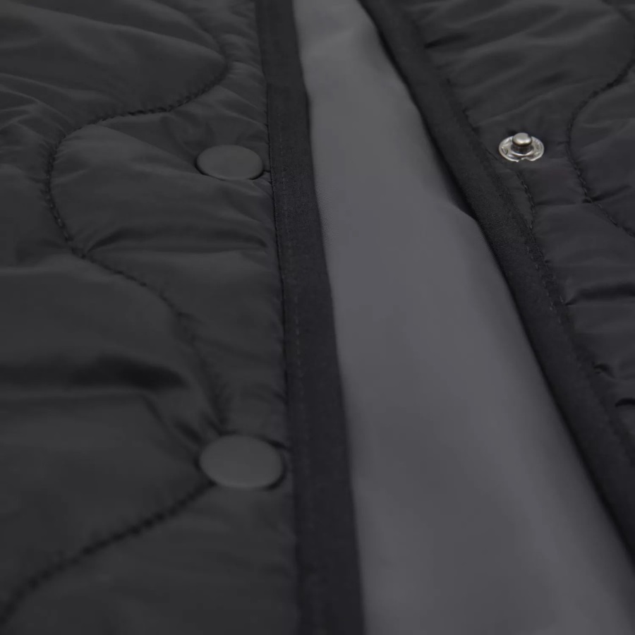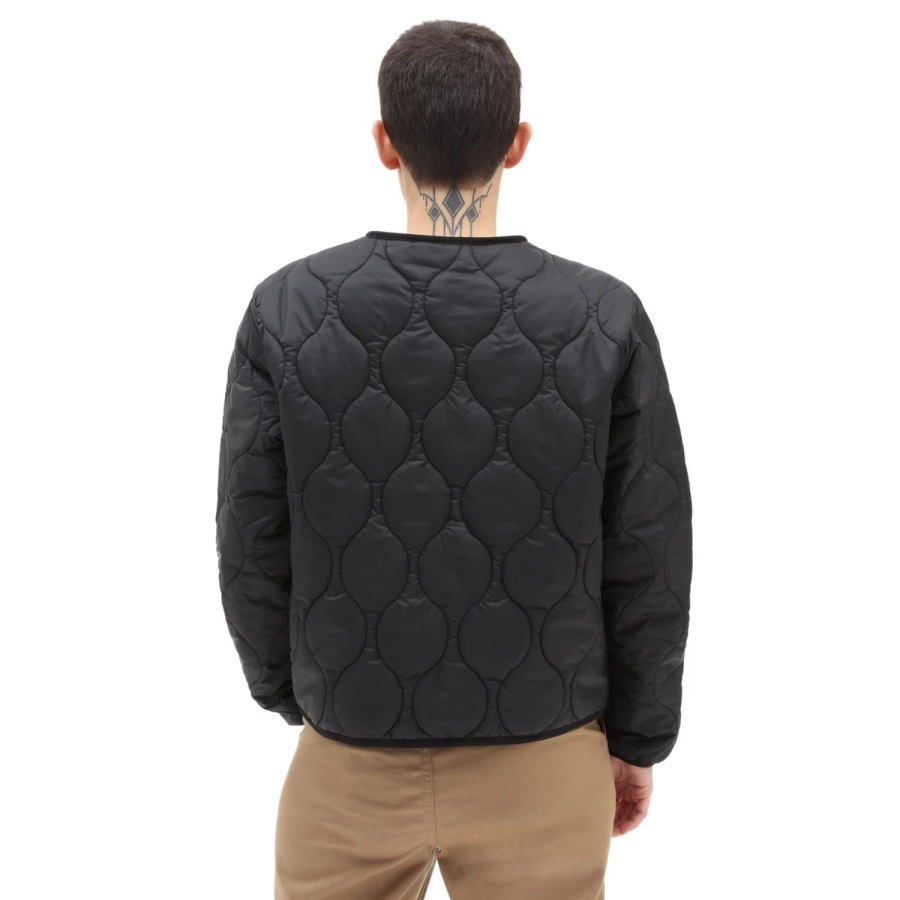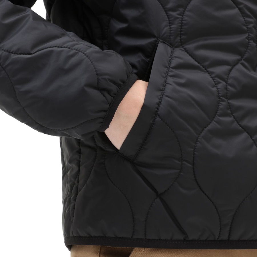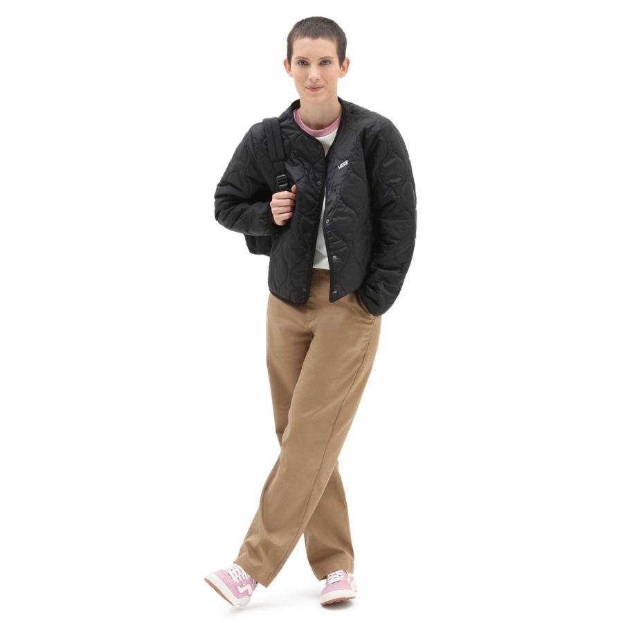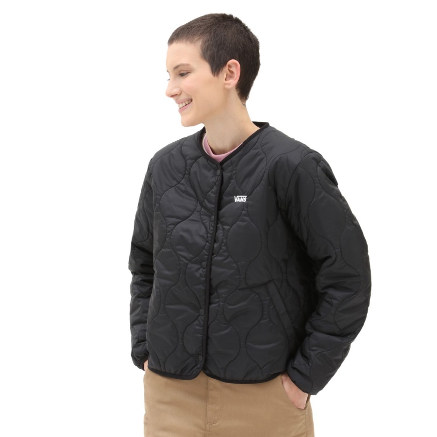 The Forces Short Rev Liner Jacket is a relaxed fit reversible liner jacket with onion quilting and 3 oz fill for extra comfort and warmth. There are pockets at the front, elastic trim detail, and the Vans logo on the left chest.