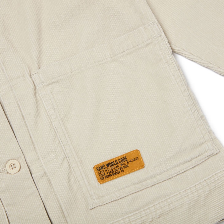 The World Code Corduroy Jacket is a cotton corduroy unlined chore coat with a snap-front closure, dual-entry lower body pockets, and a woven label at the lower body. -Unlined chore coat -100% cotton corduroy -Snap-front closure -Dual-entry lower body pockets -Lower body woven label