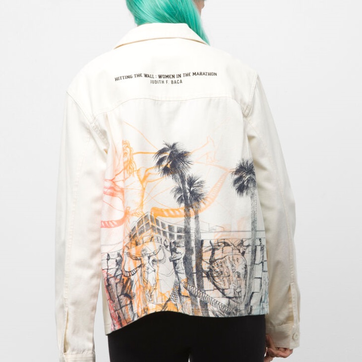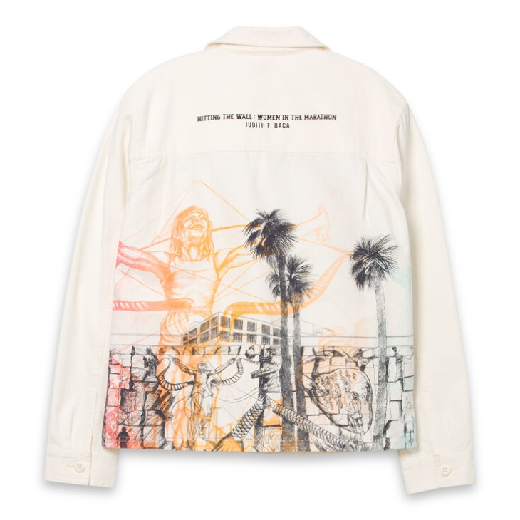 From our collection to yours Vans and the Museum of Contemporary Art, Los Angeles are two institutions that encourage the expression of creativity, and are committed to making creative expression accessible to everyone. This season, Vans and MOCA are proud to collaborate on a collection of footwear and apparel that celebrates creativity with California roots. Commemorating Judy Bacas 1984 Olympics mural, in which a female runner with her arms outstretched breaks through a finish line and takes down a brick wall with her, revealing the L.A. skyline behind, the Vans x MOCA Judy Baca Jacket features artwork from Bacas final drawing. Commissioned for the 1984 Olympic games, Bacas mural wasnt just another piece of street art. Rather, it was designed to depict a national milestone - the first time women were allowed to compete in the games. Made with cotton peached canvas, this jacket includes a gradient screen print at the back panel, patch pockets at the chest, logo embroidery at the front pocket, and a boxy fit. Model is 5 feet 9 inches tall and wearing a size Small. - Vans x MOCA collection - Back screen print from Judy Bacas Hitting the Wall, Women in the Marathon final drawing - 100% cotton peached canvas - Patch pockets at chest with logo embroidery - Boxy fit
