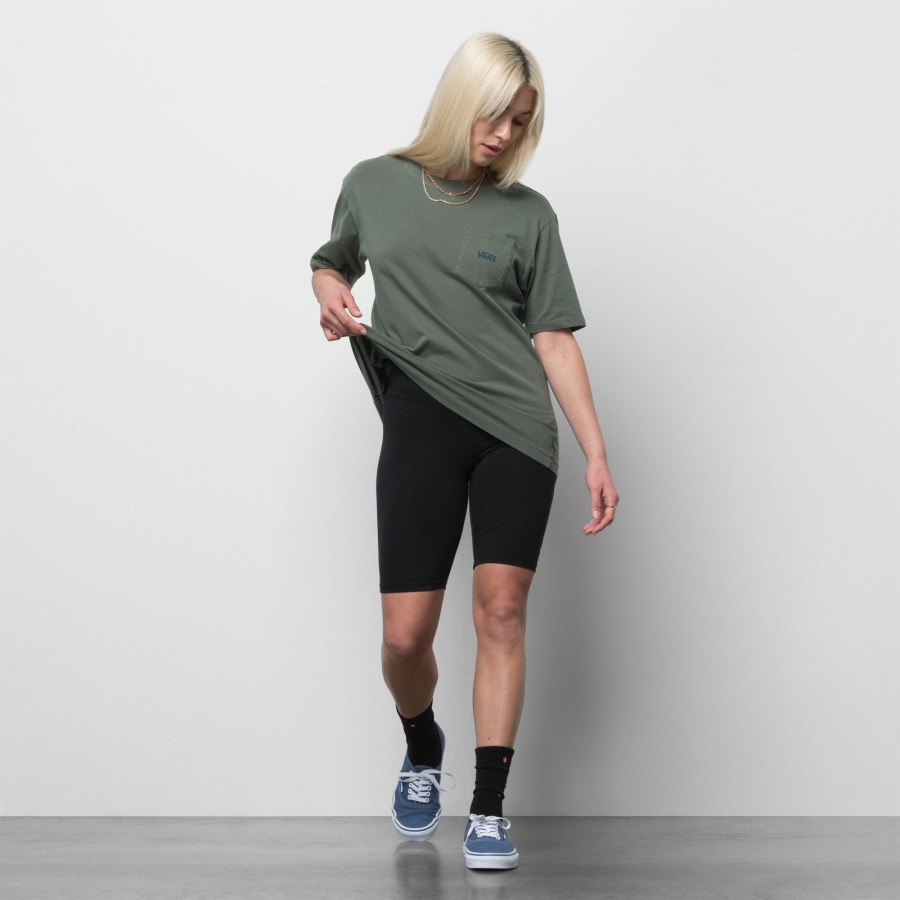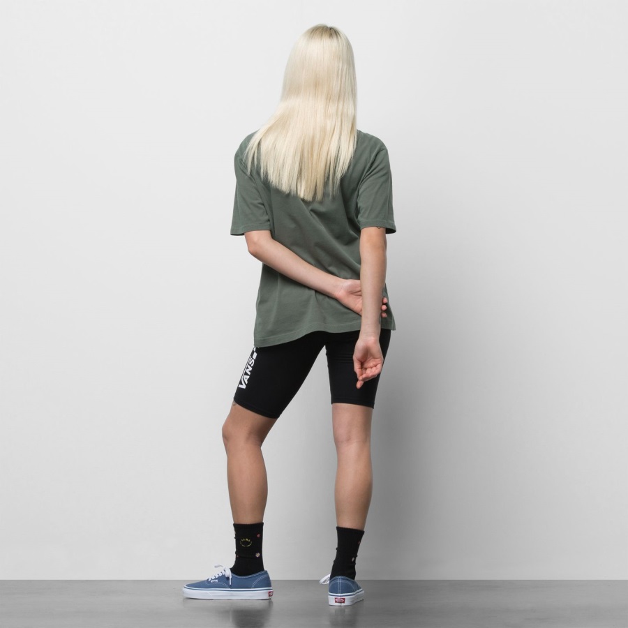 The Chalkboard Legging Short is a 93% cotton, 7% elastane legging short with a checkerboard logo screen print at the leg an da 9 inch inseam. Model is 5 feet 9 inches tall, has a 23-inch waist, and is wearing a size Small.