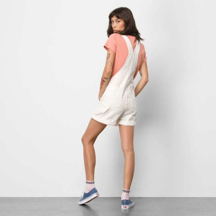 The Ground Work Shortall is a 100% cotton canvas workwear-inspired short overall with classic carpenter-style pockets and a relaxed fit. Novelty stitch details, metal fasteners, and a simple logo patch round out the utilitarian design. Model is 5 feet 9 inches tall, has a 23-inch waist, and is wearing a size Small. - 100% cotton canvas - Workwear-inspired short overalls - Carpenter-style pockets - Relaxed fit - Novelty stitch details - Metal fasteners - Inseam: 2.5 inches - Leg opening: 23.5 inches
