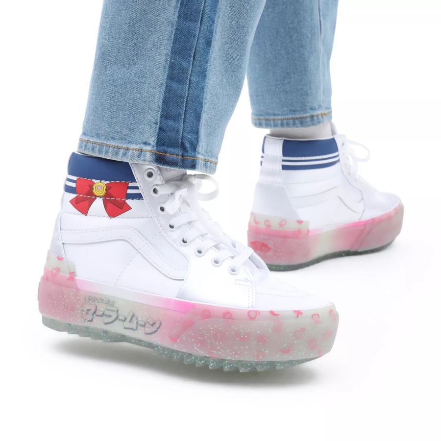 Vans and Pretty Guardian Sailor Moon have come together for a special collaboration celebrating love and justice for all. This collection of footwear and apparel invites you to team up with the Sailor Guardians and honor the popular anime.Taking our legendary high top style to a whole new level, the Vans X Pretty Guardian Sailor Moon Sk8-Hi Stacked brings the fun of the iconic show into every step. Highlighting oversized features and unexpected layers like platform bumpers, exaggerated outsoles, and translucent foxing tape, this elevated platform shoe updates an iconic favorite while blending Vans DNA with details from Sailor Moon's iconic costume. It also includes lace-up leather and textile uppers and supportive padded collars.