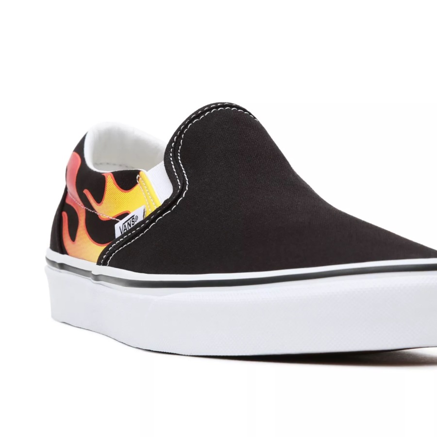 The Flame Classic Slip-On features sturdy low profile slip-on canvas uppers with a flame print, padded collars, elastic side accents, and signature rubber waffle outsoles.