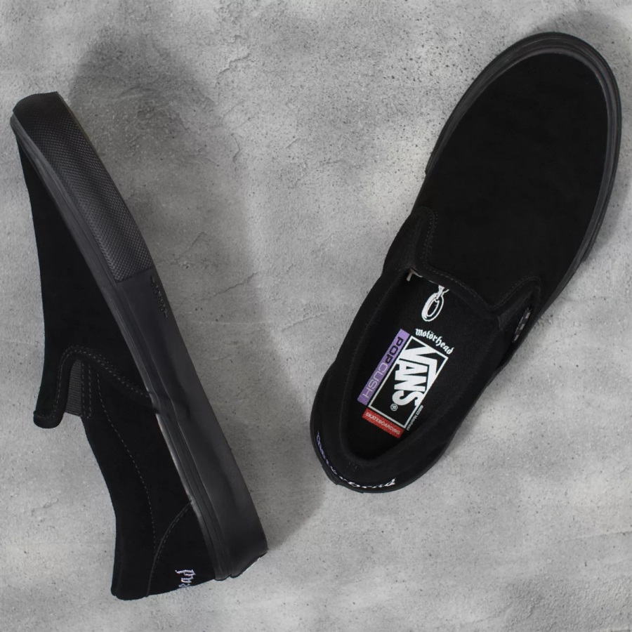 Motörhead formed in 1975 with one simple goal: to make loud, fast, and vicious rock. Mixing rock and roll, heavy metal, and punk rock, Motörhead blazed a brand new trail and cemented their place in music history. For forty years, Motörhead rocked without ever letting up.Celebrating this legendary band, the Vans x Motörhead Skate Slip-On delivers more of what skateboarders need to enable maximum progression. The repositioned DURACAP™ reinforced underlays and fully redesigned uppers, combined with a new two-part foxing tape that features a deeper knurl pattern on the toe, make the new Skate Slip-On durable enough to withstand daily skateboarding abuse. For more board control, the new molded heel counter and internal tongue straps lock in your feet. Even the gum rubber sole that made Vans famous has been elevated with the SICKSTICK™ rubber compound to deliver more grip and boardfeel. Plus, POPCUSH™ energy return sockliners provide superior cushioning and impact protection while helping to lessen leg fatigue for longer skate sessions.Along with sturdy suede uppers and Motörhead logo embroidery at the heels, the Skate Slip-On gives you the iconic look you want while bringing all the performance benefits skateboarders demand.