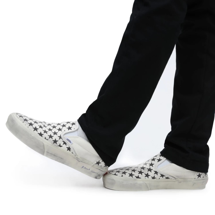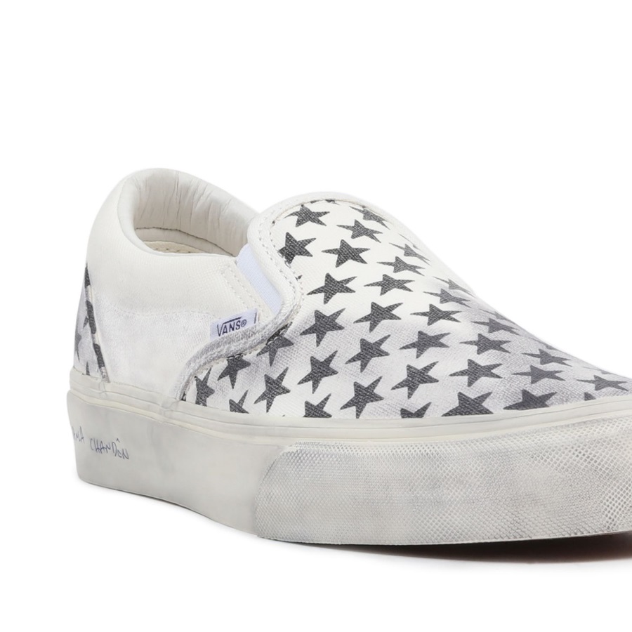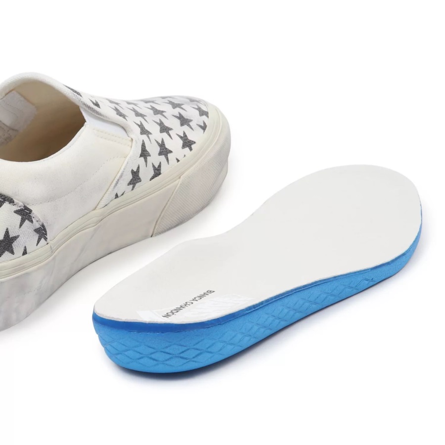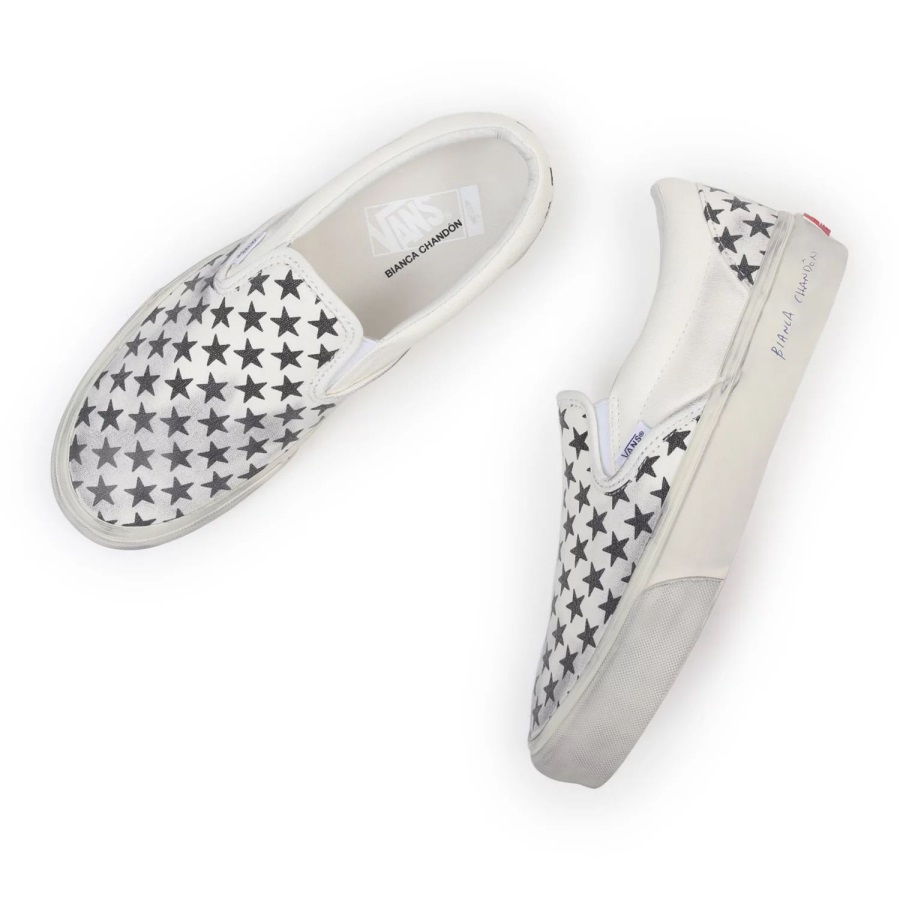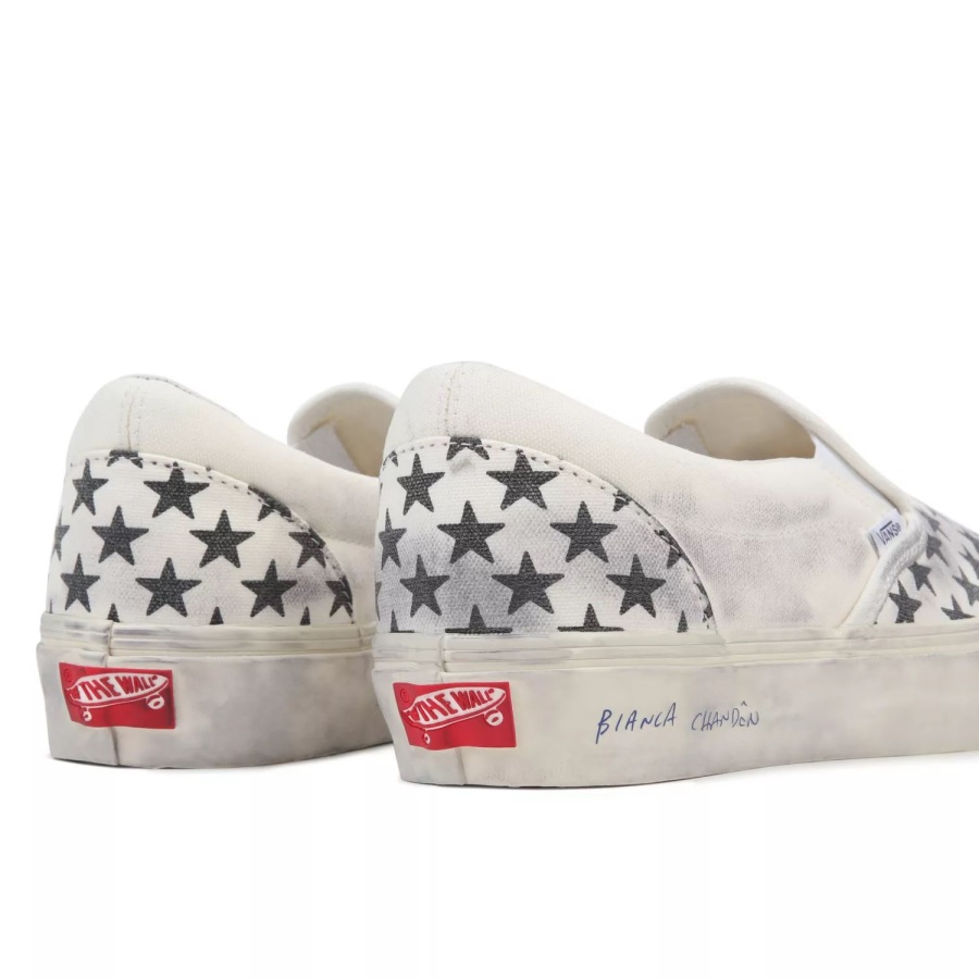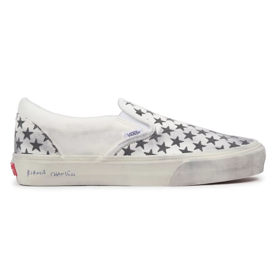 Bianca Chandôn was founded in 2013. With skate culture making its way deeper into the fashion spotlight.Bianca Chandôn is named after Bianca Jagger and Chandôn, which itself was inspired by French race car driver Olivier Chandôn-two cultural icons of the late 1970s and early 1980s. Inspired by these eras and vintage Americano Vans patterns, the Bianca Chandôn Classic Slip-On was designed to give the shoe a true DIY skate vibe and recreate the iconic worn aesthetic.Washed canvas with a repeated star pattern reinforces the timeless vibe of this slip-on shoe, while a ball point signature on the sidewall offers a subtle stroke of Bianca Chandôn branding. Finally, for an added nod to how great Vans look slightly thrashed, the uppers and sidewalls were hit with a greasing treatment by hand to provide a true broken-in look and feel. The custom packaging and footbeds add another unique touch to this elevated silhouette.