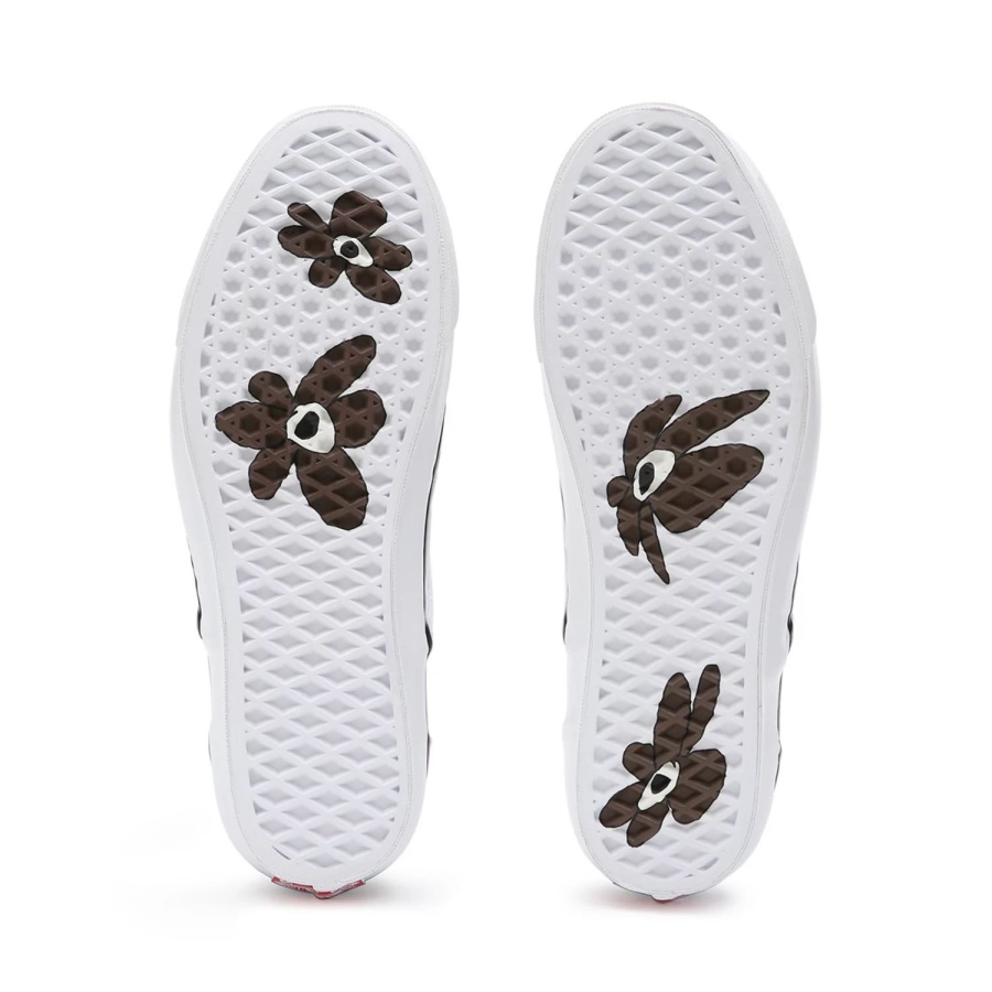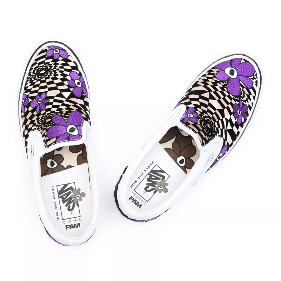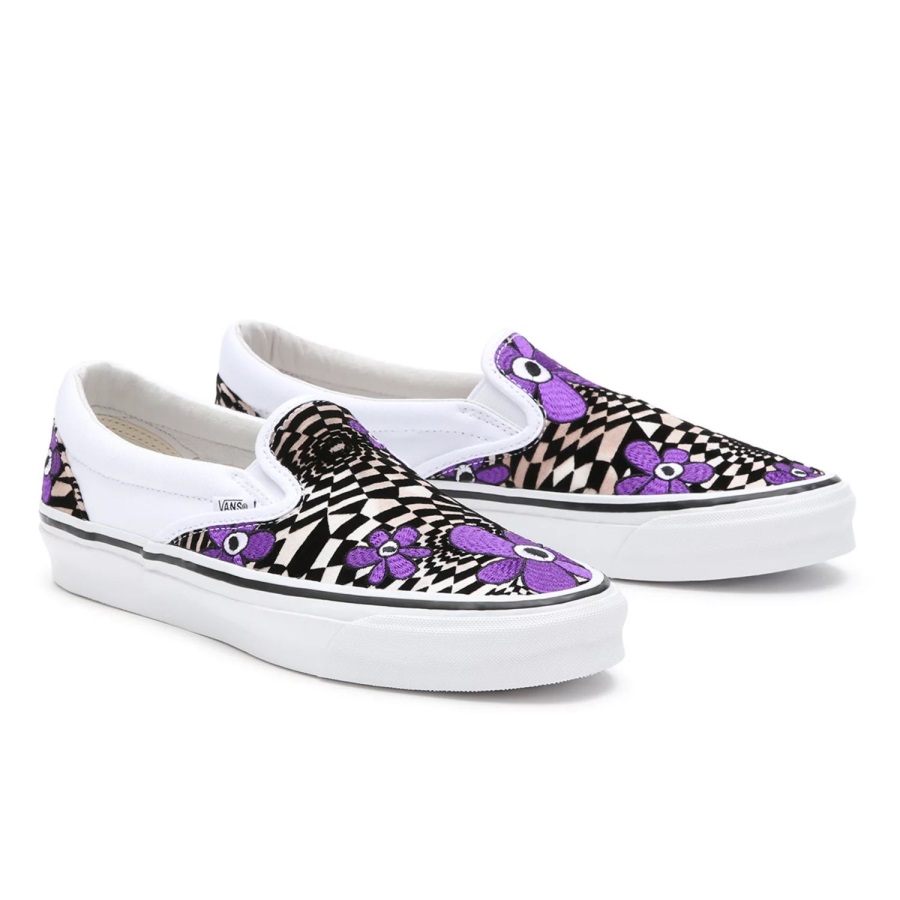 Low profile slip-ons, the Vault By Vans X Perks and Mini OG Classic Slip-On LX Shoes have elastic side accents and padded collars for extra comfort. They also feature the Vans flag label, signature waffle outsoles for firmer grip and flower imagery on the wafflesole. An allover checkerboard print with flower embroidery completes the look.