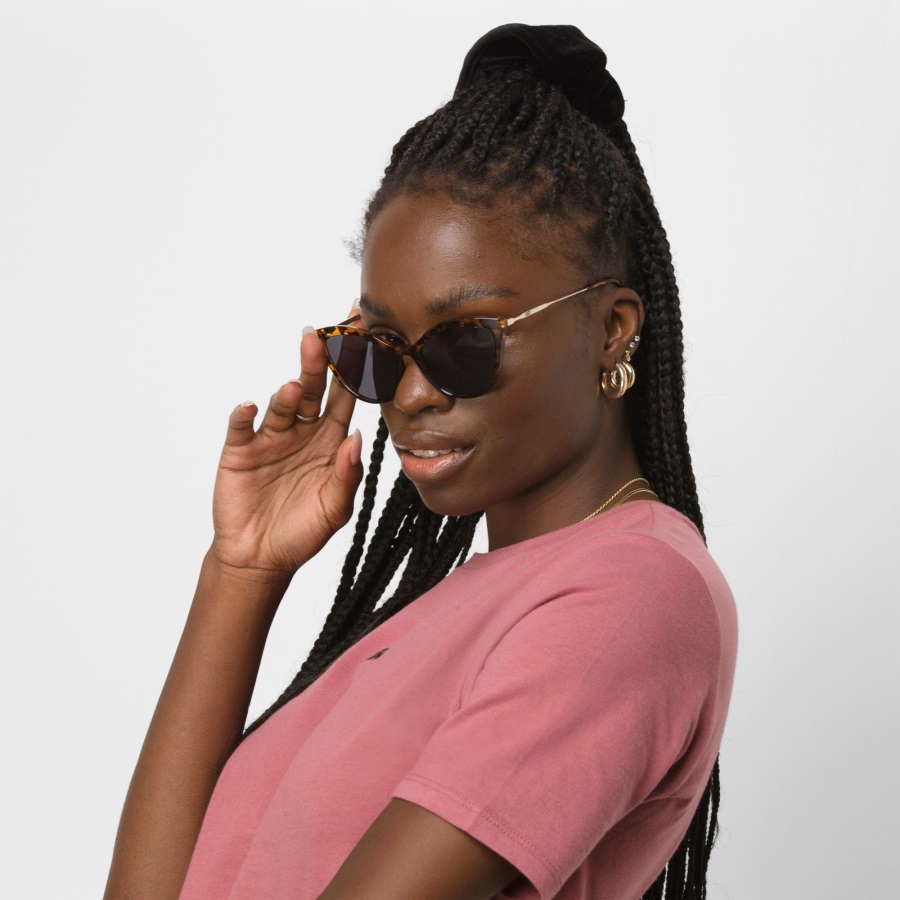The Clear View Sunglasses are 73% polycarbonate, 27% cupronickel cat-eye frame sunglasses with metal arms and 100% polycarbonate lenses.