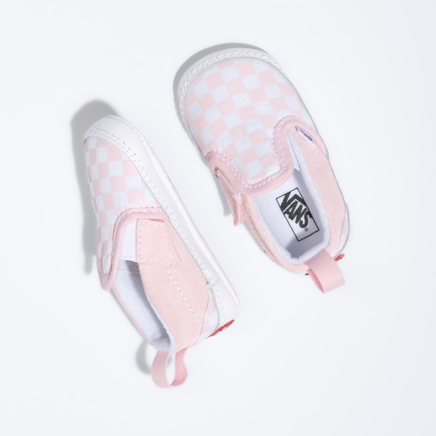The Checker Slip-On Crib, redesigned for a perfect fit in the style of the original Classic Slip-On, features heel pulls for easy on-and-off functionality, hidden gore, and printed canvas and suede uppers with the authentic checkerboard pattern. A new print on the outsole mimics the iconic Vans waffle sole, and the addition of a Vans heel scab completes the classic look.