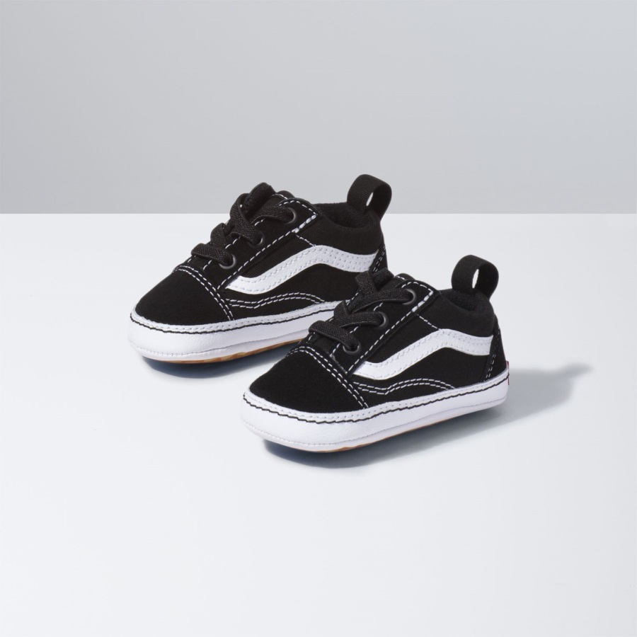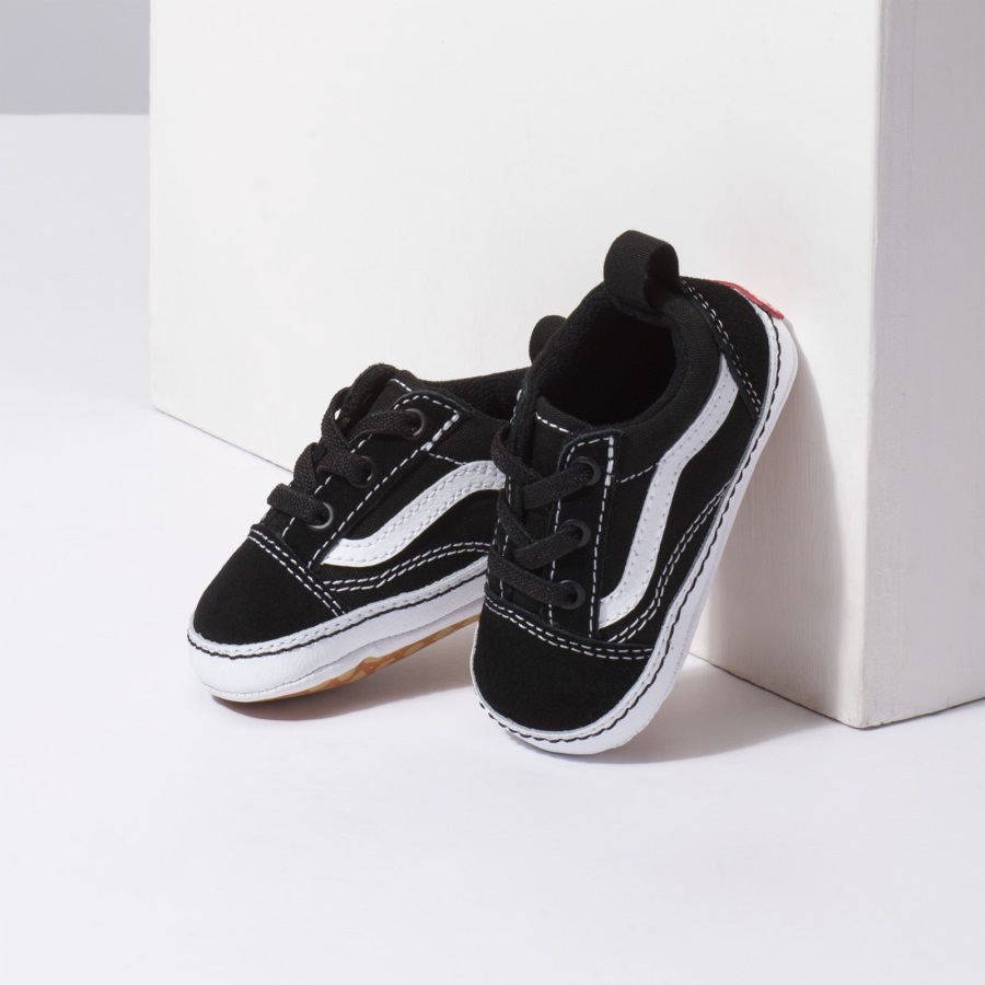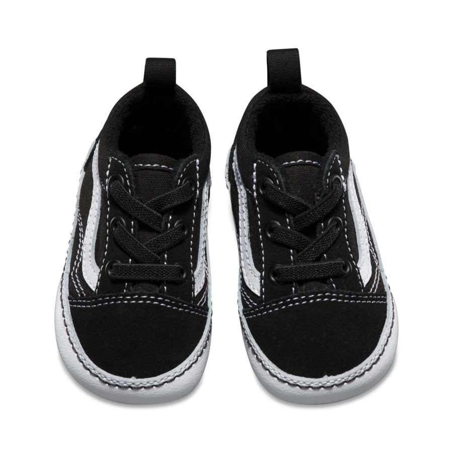 The Old Skool Crib, redesigned for a perfect fit in the style of the original Old Skool, features sturdy canvas and suede uppers, elastic accents, and heel pulls for an easy on-and-off fit. A new print on the outsole mimics the iconic Vans waffle sole, and the addition of a Vans heel scab completes the classic look.