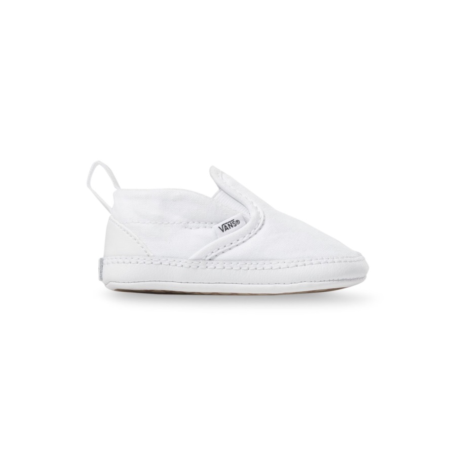 The Infant Slip-On V Crib, redesigned for a perfect fit in the style of the original Classic Slip-On, features sturdy canvas and leather uppers, elastic side accents, and heel pulls for an easy on-and-off fit. A new print on the outsole mimics the iconic Vans waffle sole, and the addition of a Vans heel scab completes the classic look.
