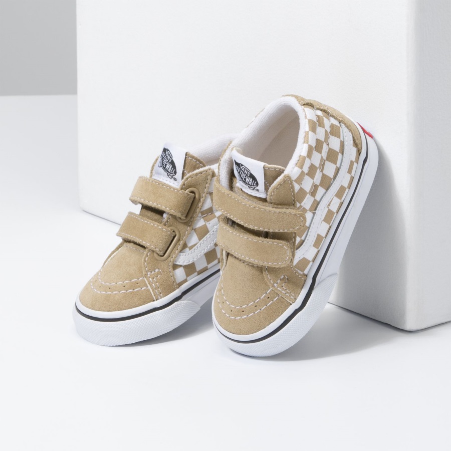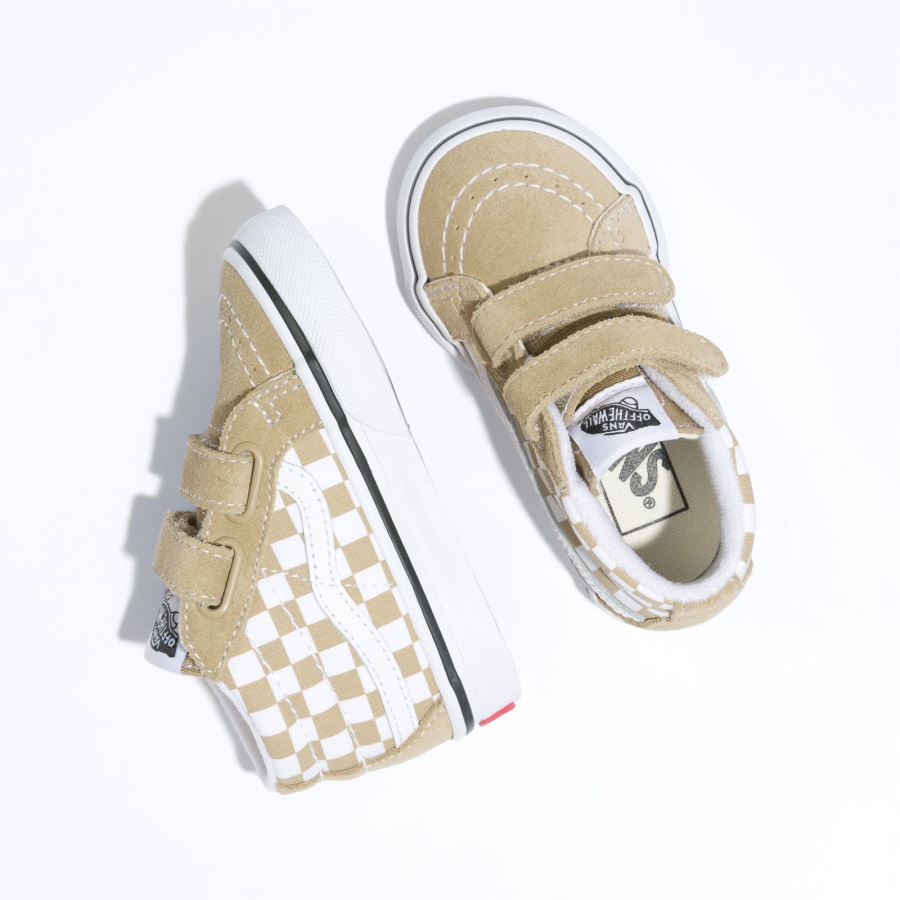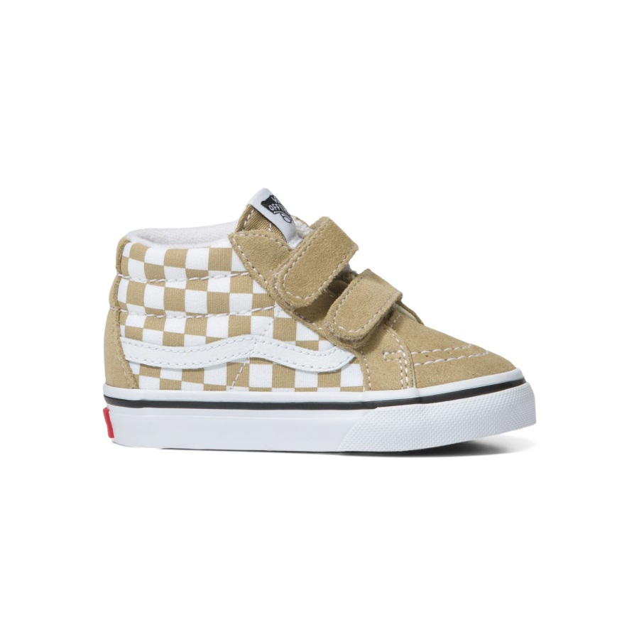 Made with sturdy suede and canvas uppers featuring our signature checkerboard print, the Color Theory Toddler Sk8-Mid Reissue V honors our reissued mid top shoe with eye-catching colorways ideal for the season. Along with double hook-and-loop closures instead of traditional laces, this timeless sidestripe style includes reinforced toe caps, supportive padded collars, and signature rubber waffle outsoles.