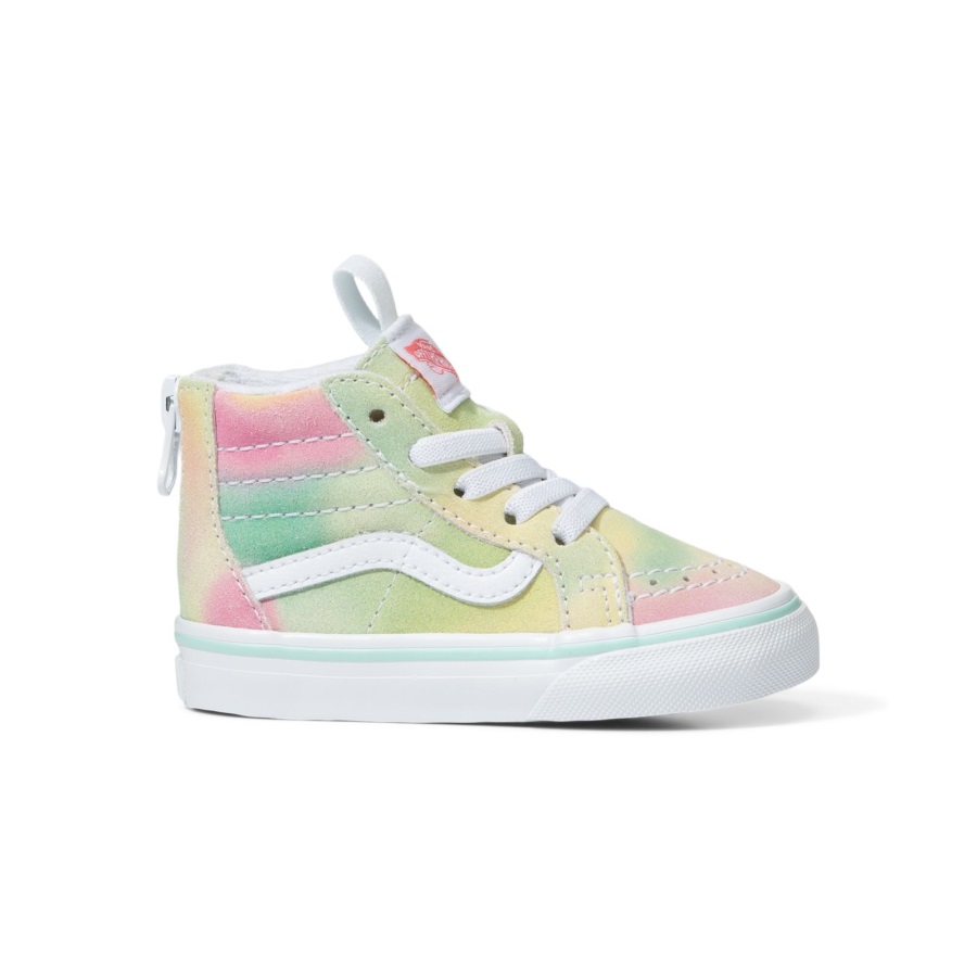 The Rainbow Suede Toddler Sk8-Hi Zip combines the legendary Vans lace-up high top with a zipper entry at the heel, providing increased access and versatility. Along with durable suede uppers featuring an allover rainbow sherbet wash, this classic sidestripe style comes equipped with supportive padded collars, reinforced toe caps, and signature rubber waffle outsoles.