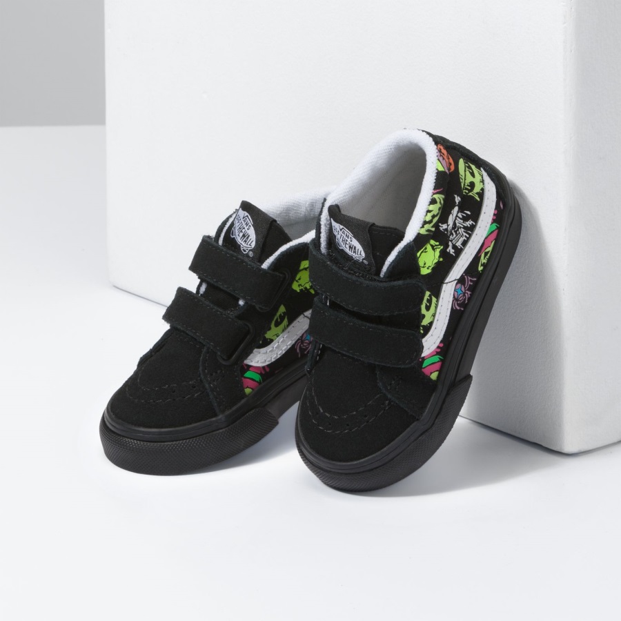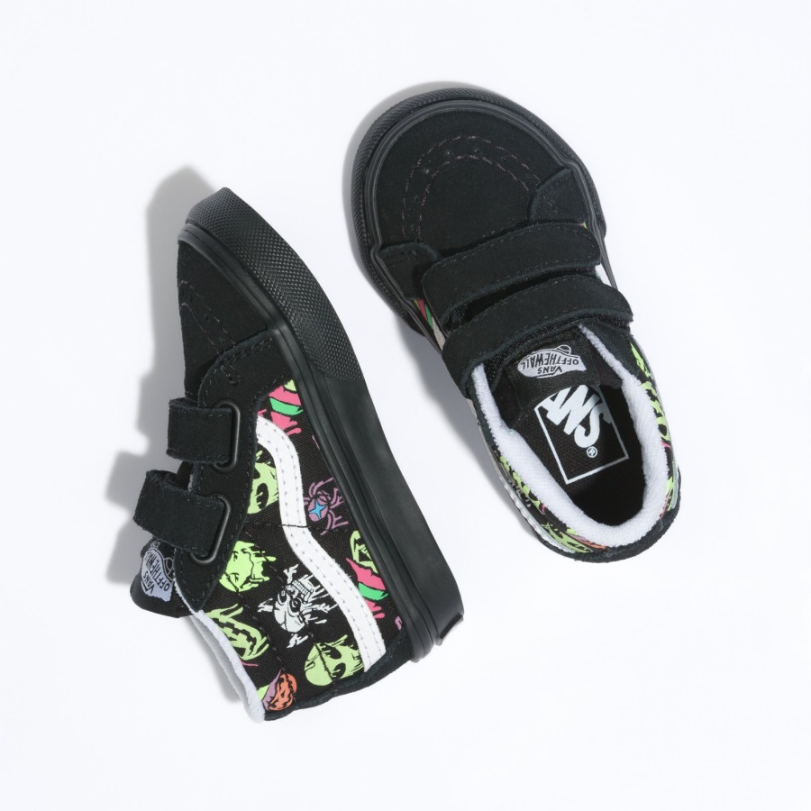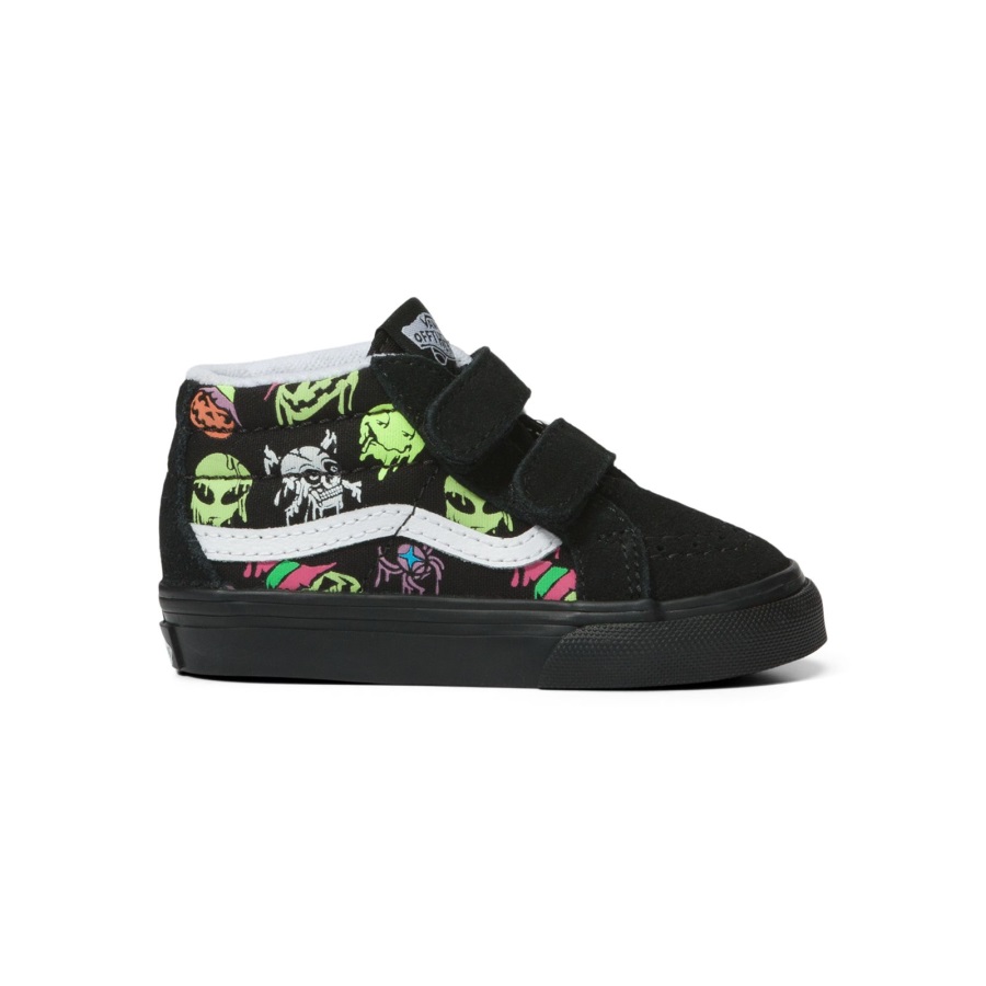 The Trippy Drip Toddler Sk8-Mid Reissue V reimagines our legendary reissued mid top by swapping traditional laces for double hook-and-loop closures. Featuring jack-o-lanterns, witch hats, skeletons, and trippy smiley faces, this sidestripe style maintains its classic appeal while providing an easy, secure fit that will keep your little ones comfortable all day.